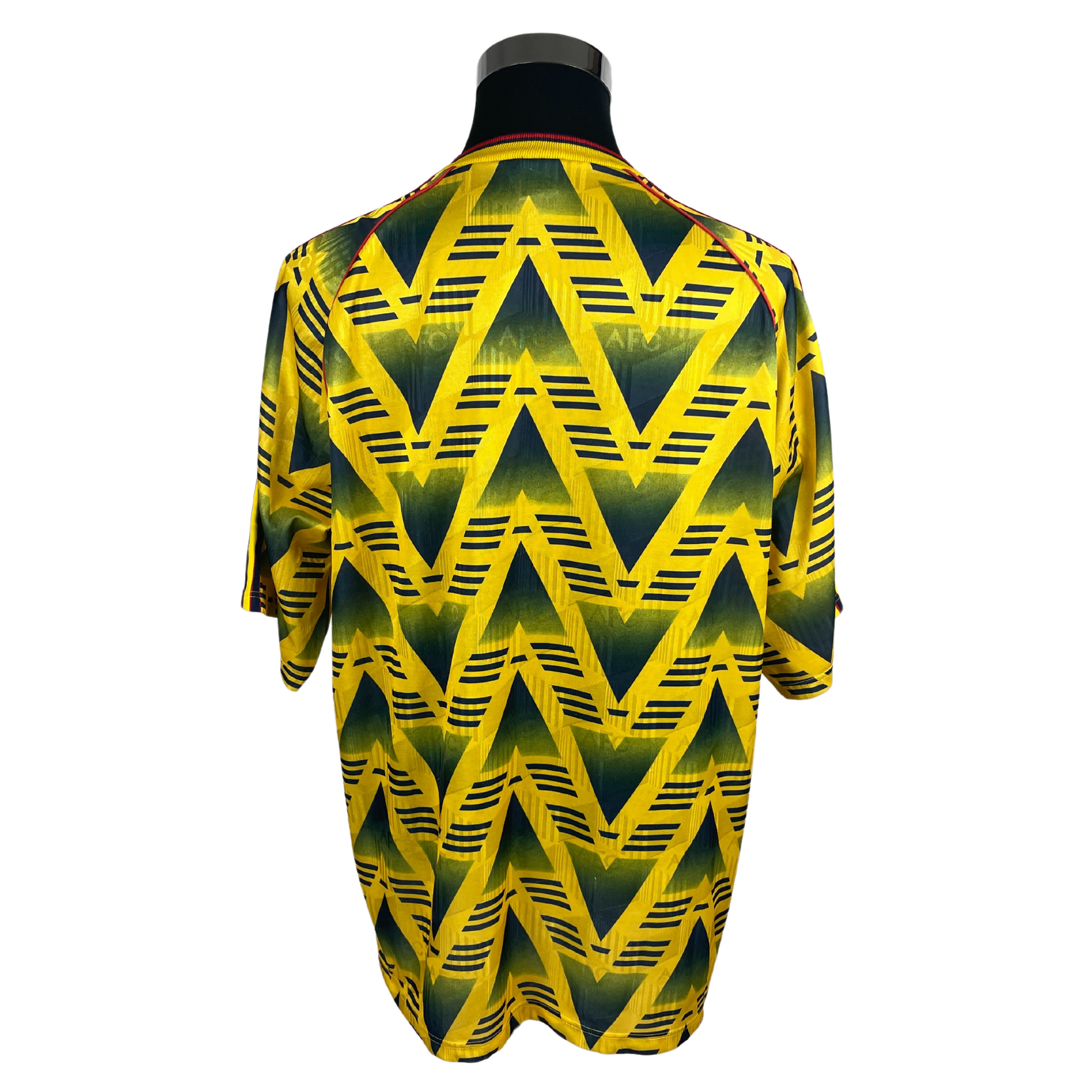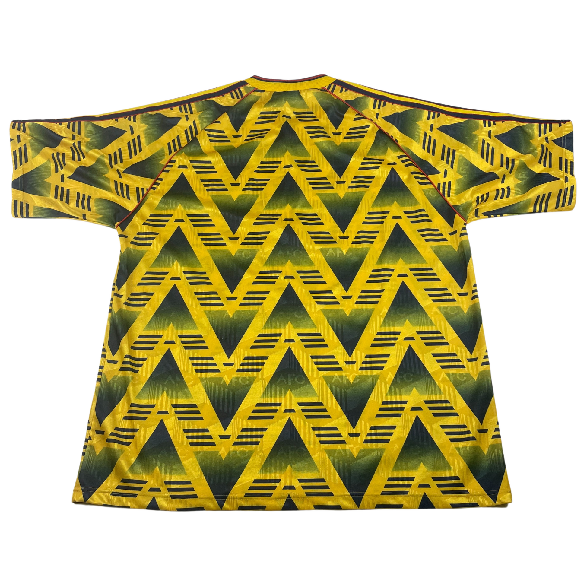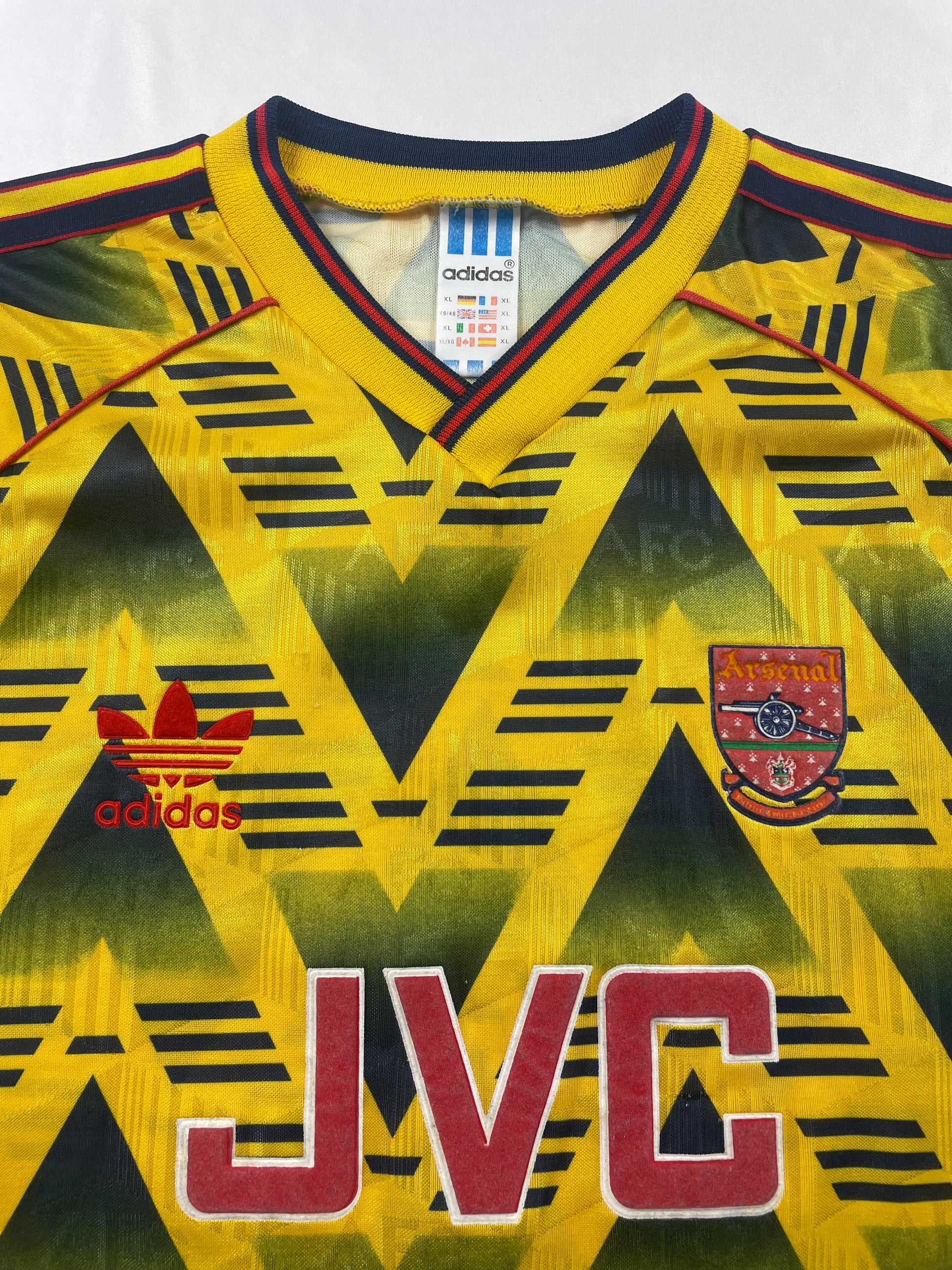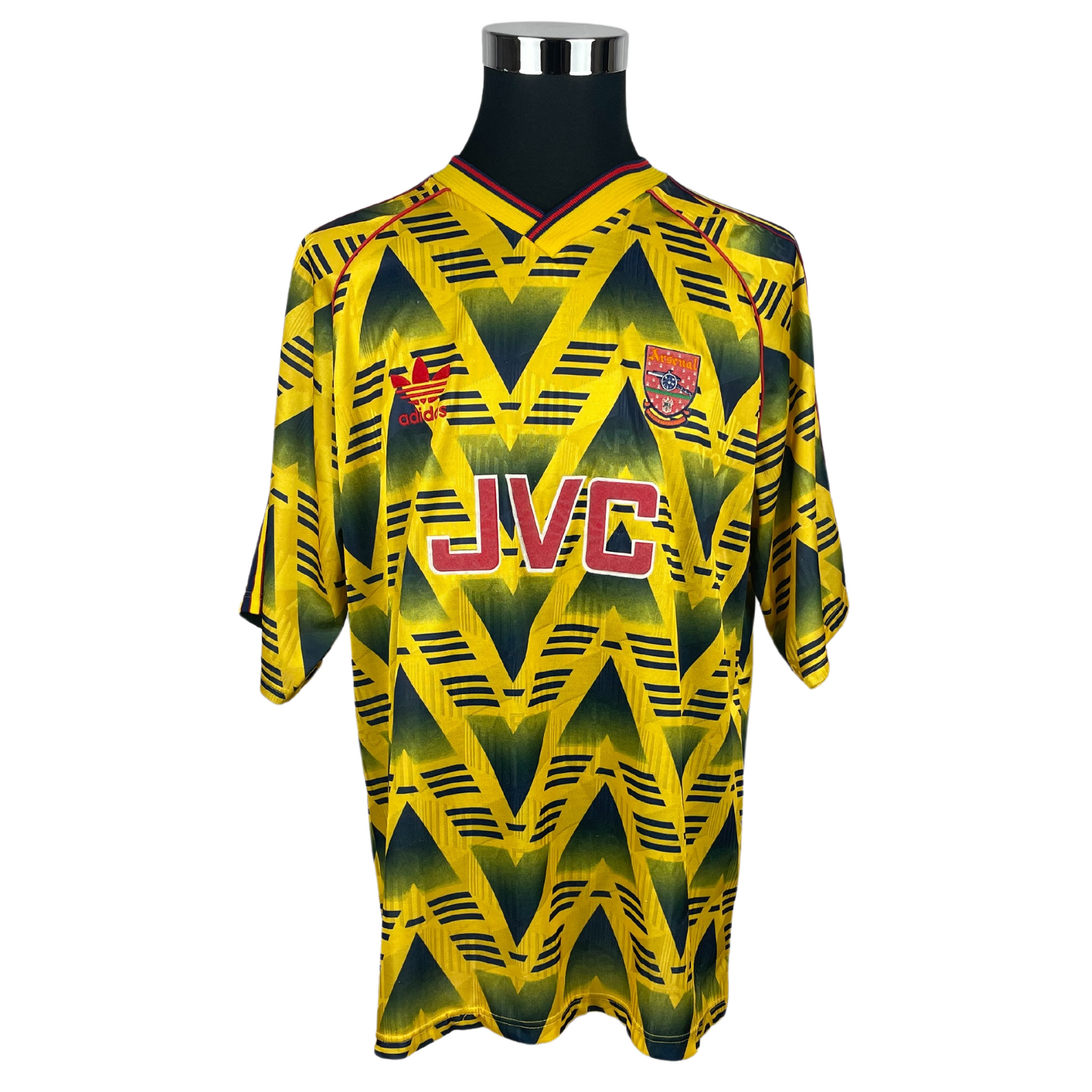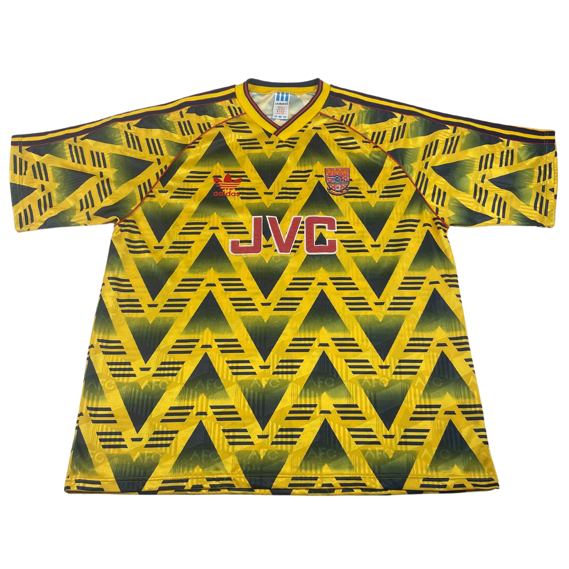 Le fameux design «bruised banana» porté de 1991 à 1993. Ce maillot est devenu l'un des modèles les plus emblématiques d'Adidas. L'équipe de George Graham n'a pas réussi à remporter un trophée lors de la première saison, tombant de la FA et de la Coupe de la Ligue au troisième tour et terminant 4e en championnat. La deuxième saison a apporté plus de succès puisque les Gunners ont remporté les deux coupes nationales, cependant, ils ont chuté à la 10e place lors de la saison de fondation de la Premier League. Le design a également été porté de manière mémorable lorsque Ian Wright a marqué un triplé lors de ses débuts en championnat à Southampton. Ce fut le dernier maillot Adidas à arborer le logo «trèfle» dans le paysage du football anglais.
