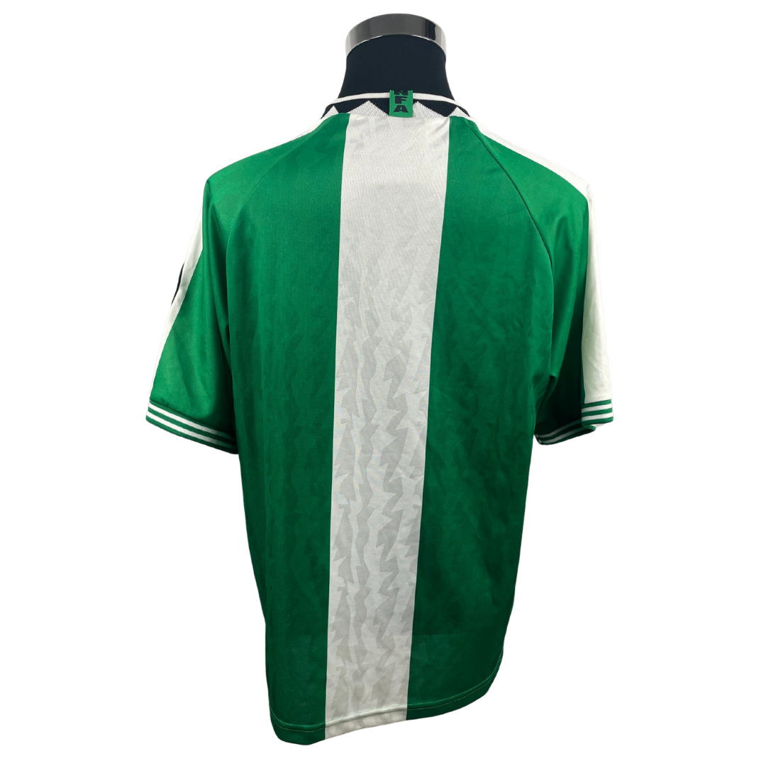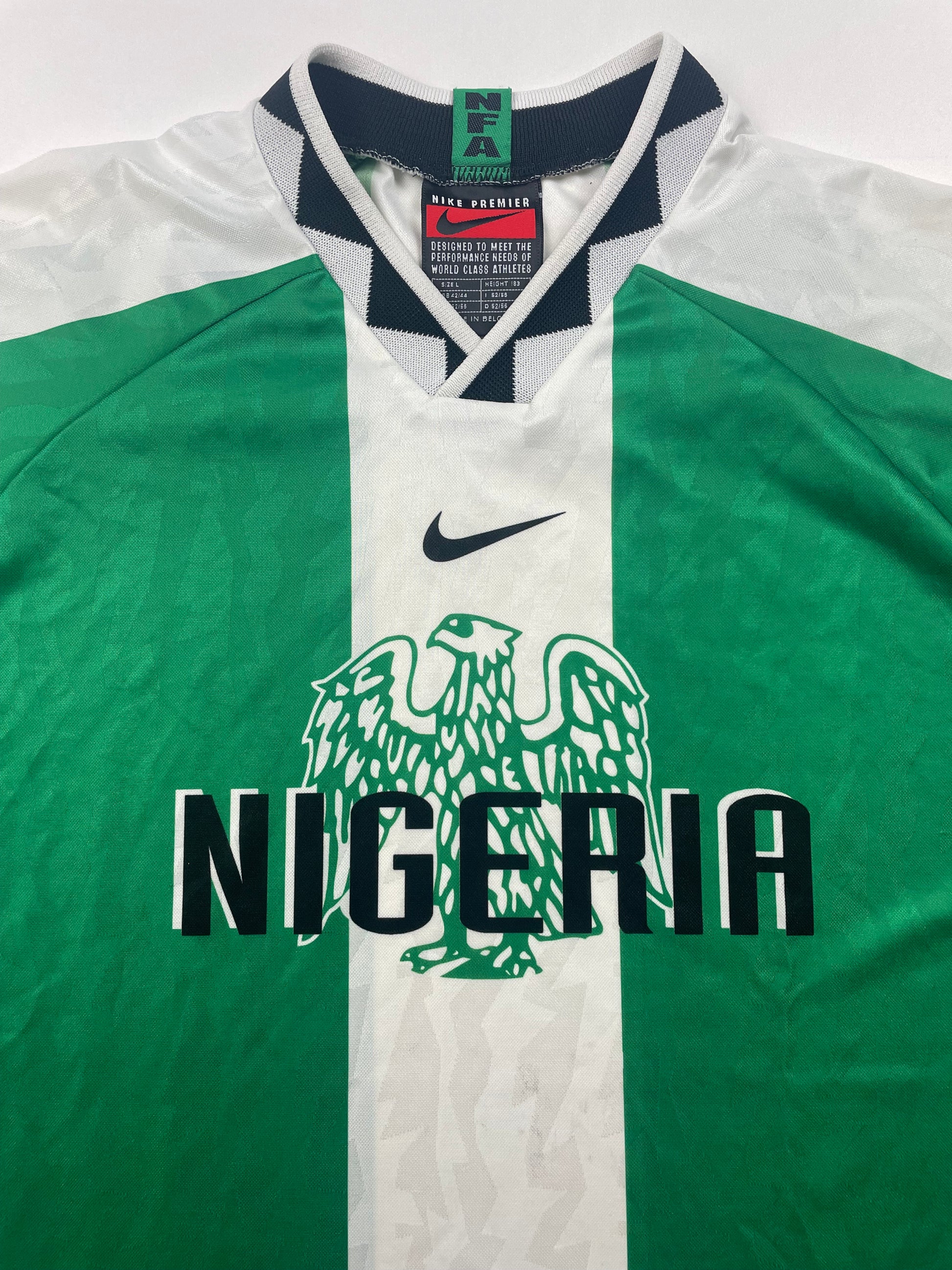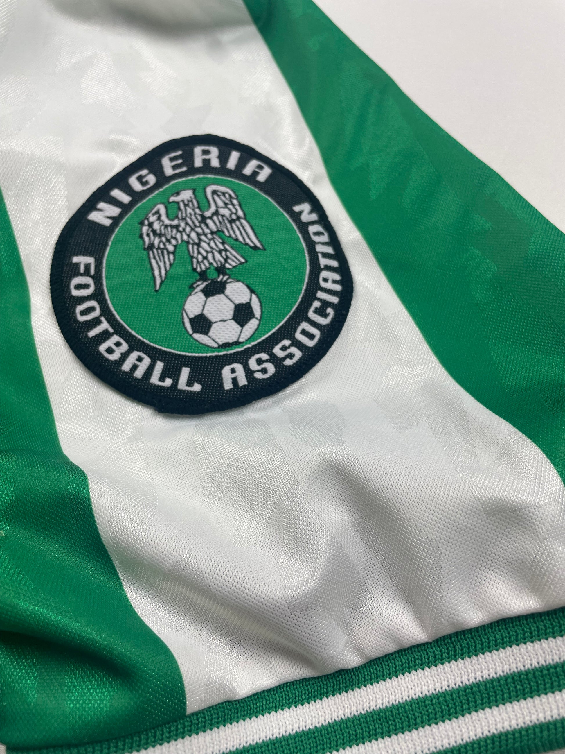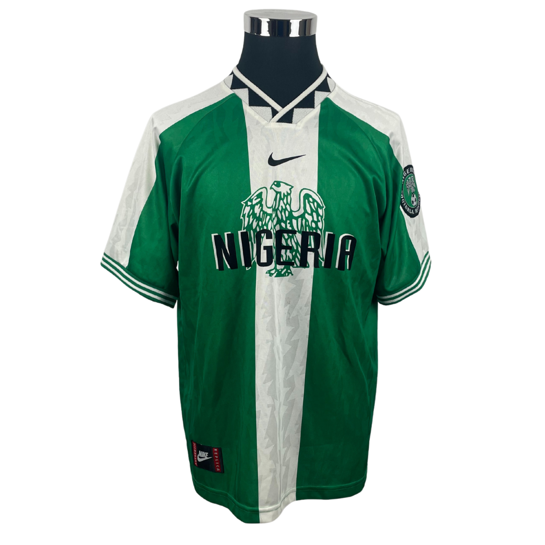 Maillot domicile des Super Eagles avec lequel ils remportent la médaille d'or lors des Jeux Olympiques d'Atlanta en 1996 après avoir notamment battu le Brésil lors de la demi-finale et l'Argentine en finale.