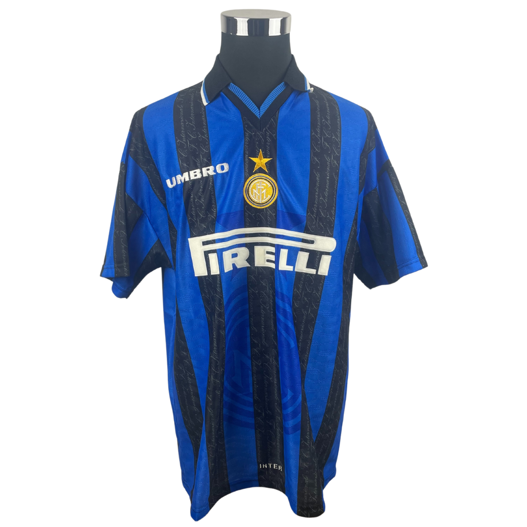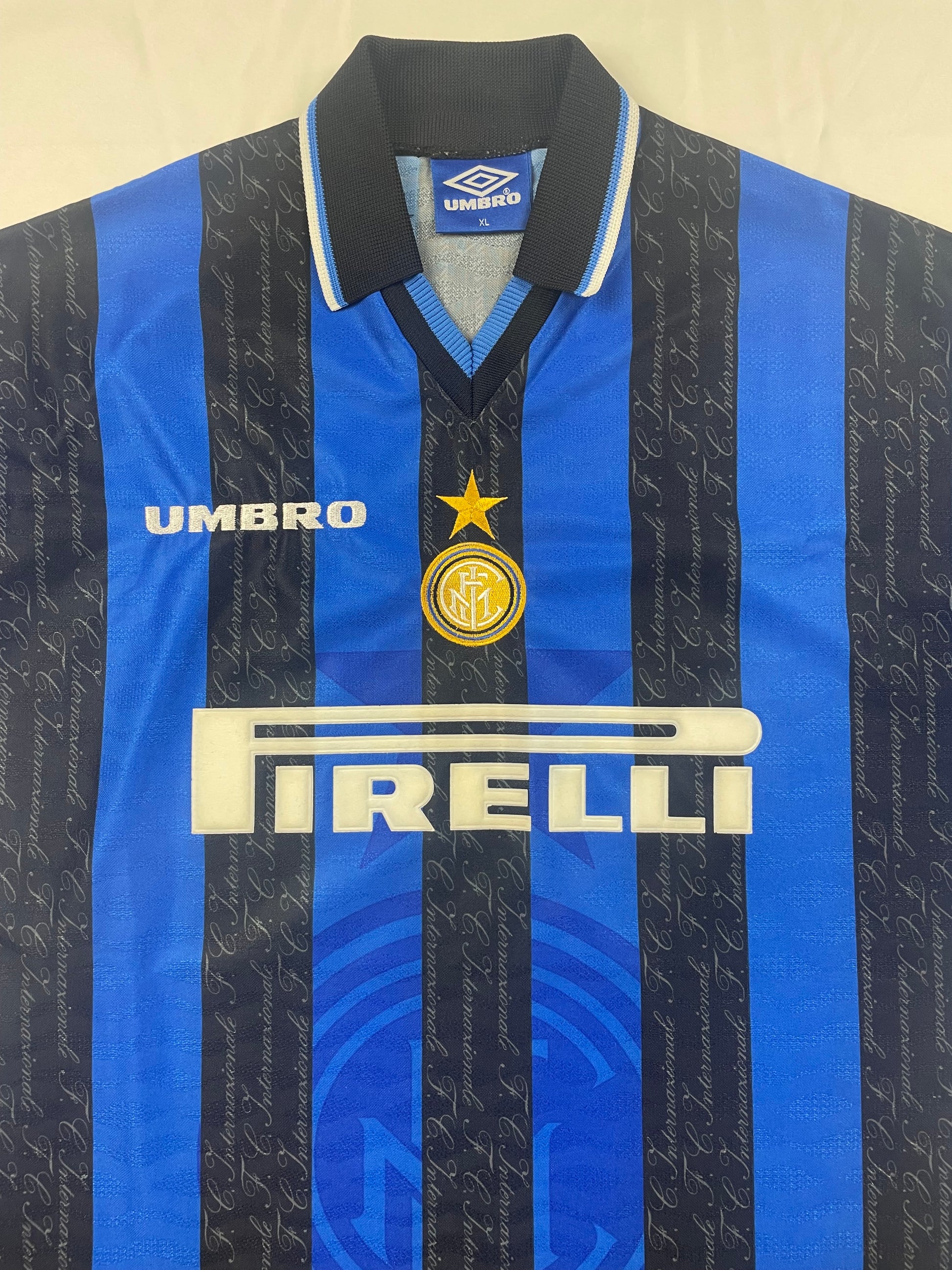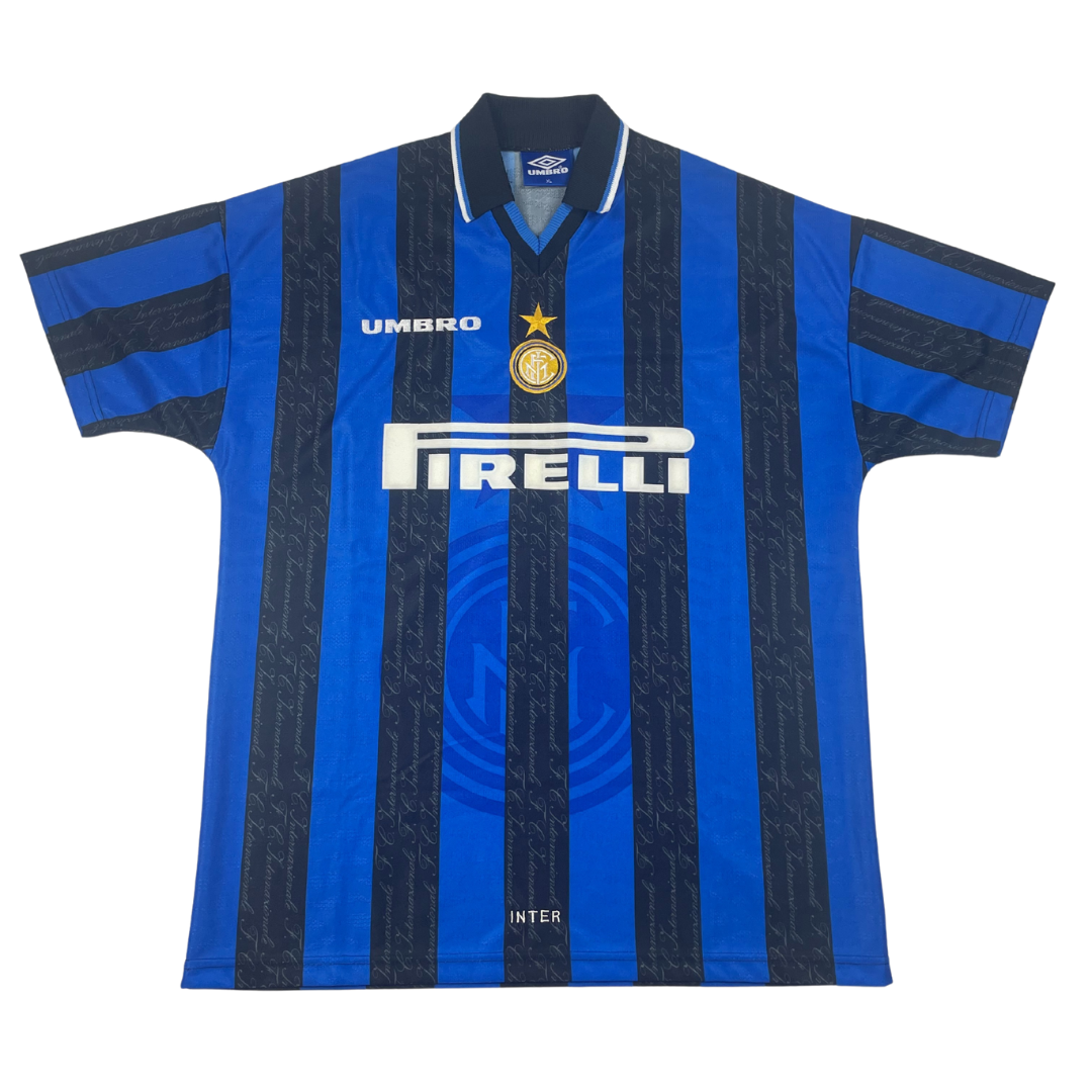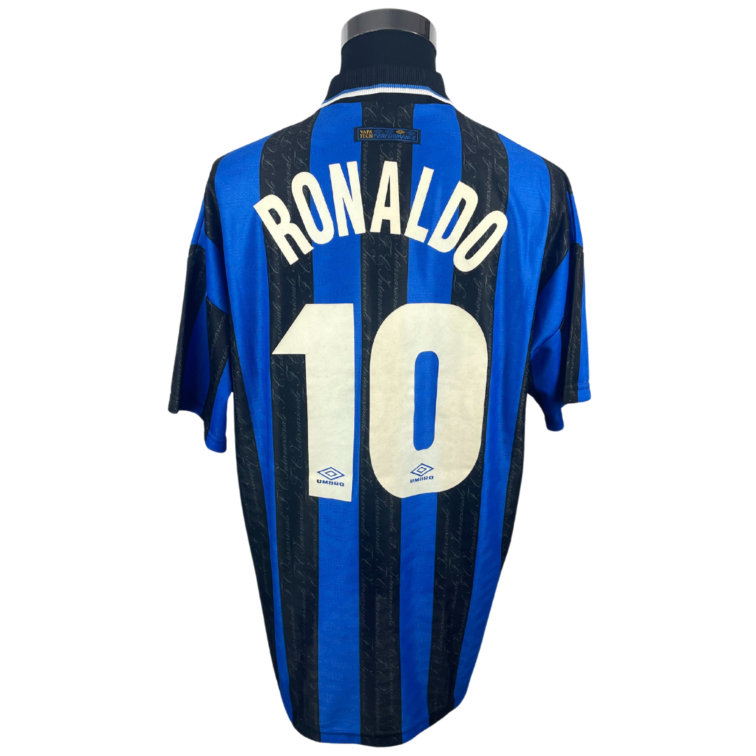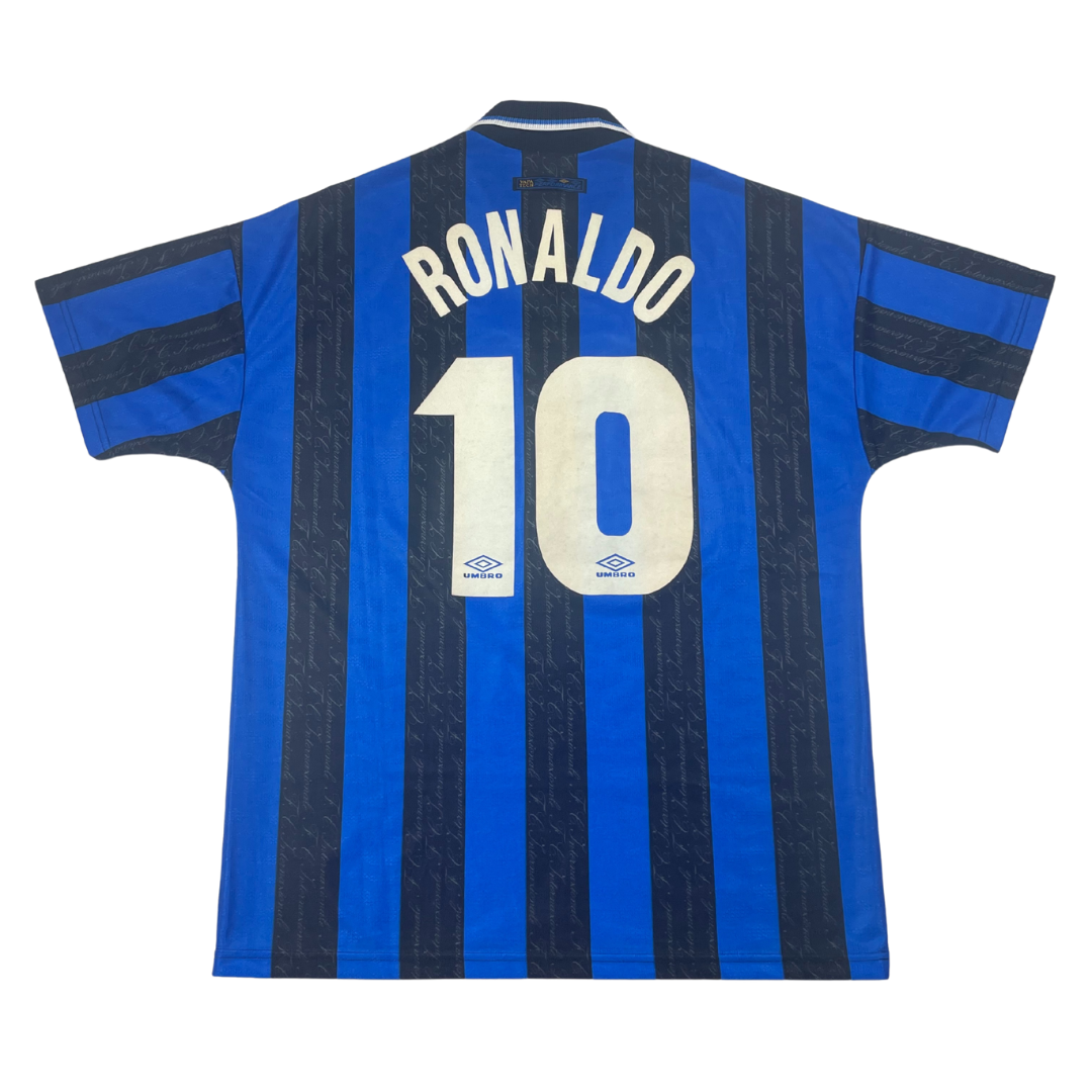 Maillot domicile utilisé par les Nerazzurri lors de la première saison de Ronaldo au club suite à son transfert record à l'époque. Le club remporte la Coupe de l'UEFA et termine second du championnat. La star brésilienne inscrit 34 buts en 47 matchs et décroche le titre de meilleur joueur de Serie A ainsi que celui du meilleur joueur FIFA pour la seconde année consécutive.