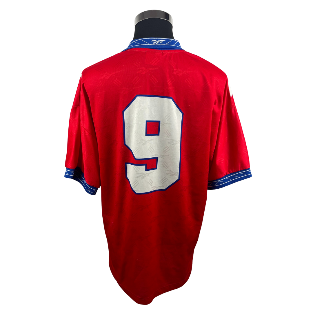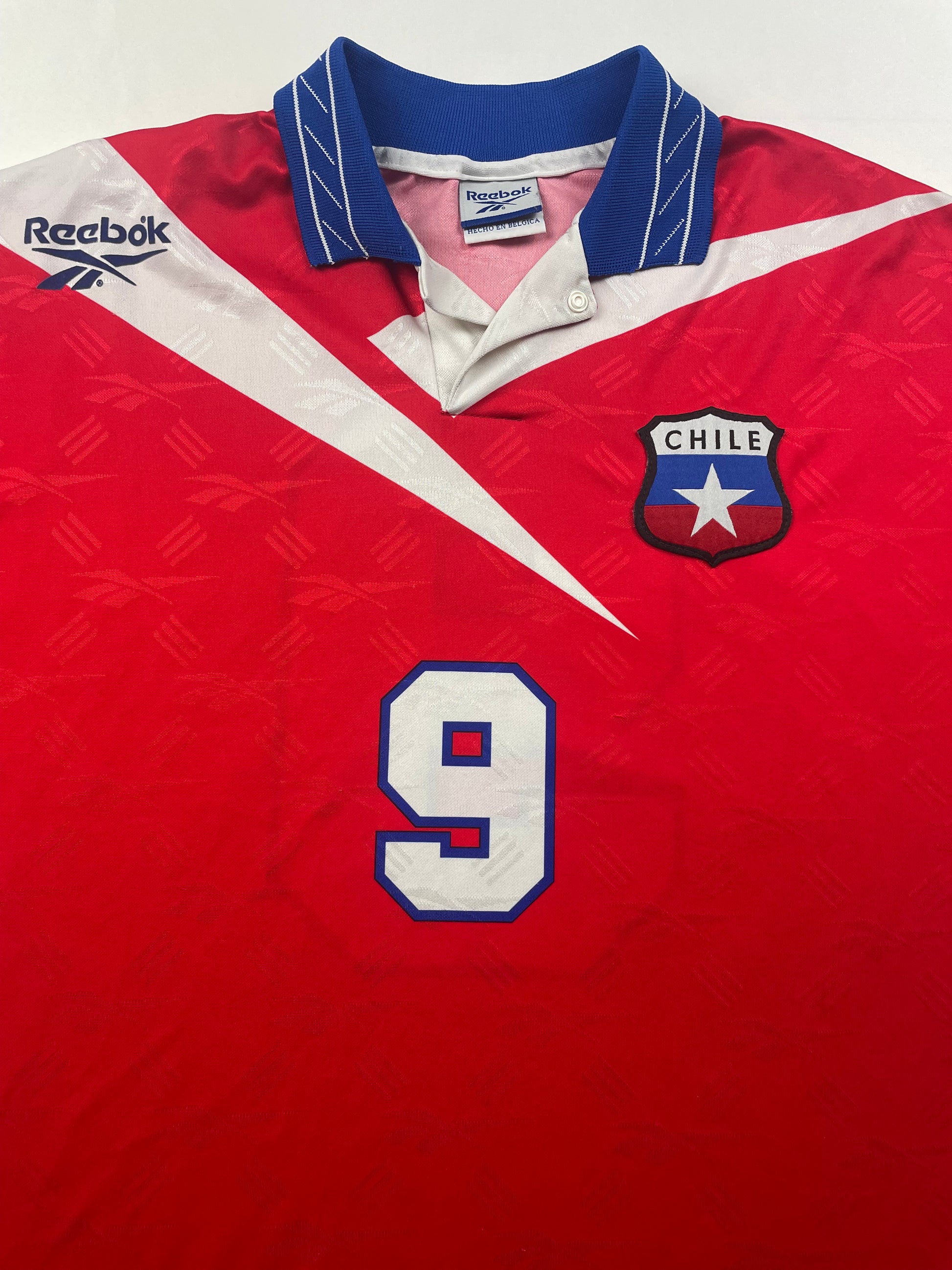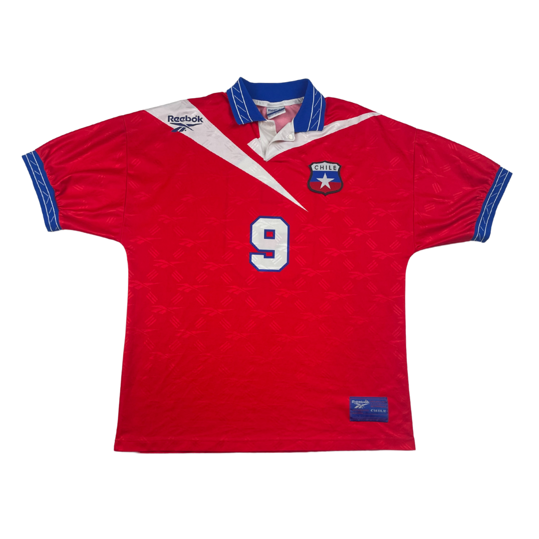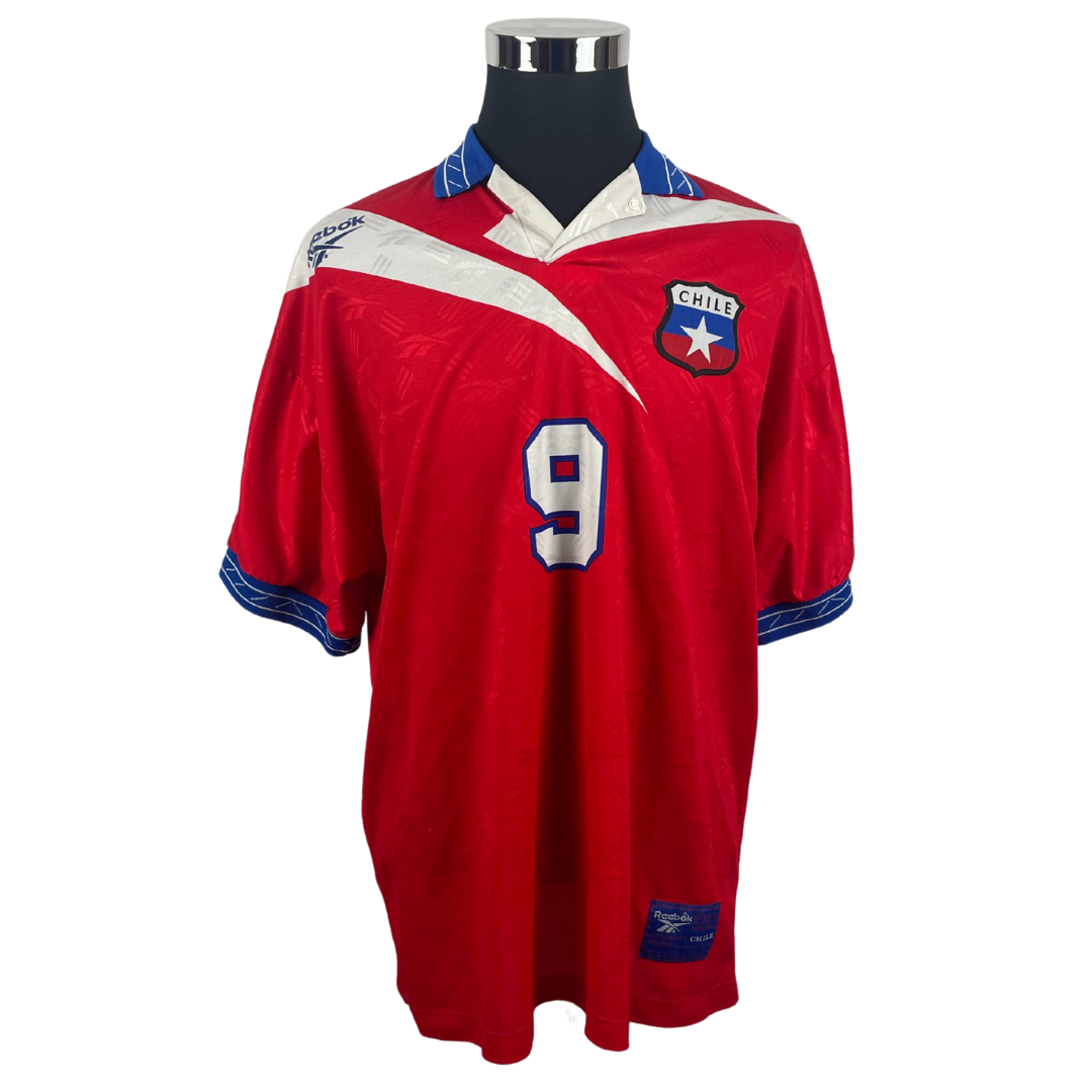 Très beau maillot utilisé lors de la Coupe du Monde 1998. Les chiliens sortent de la phase de poules mais n'offrent pas une grande résistance face au Brésil en huitième de finale malgré une attaque composée du duo Salas-Zamorano. Ce dernier ayant inscrit un quintuplé contre le Venezuela lors des qualifications pour le mondial.