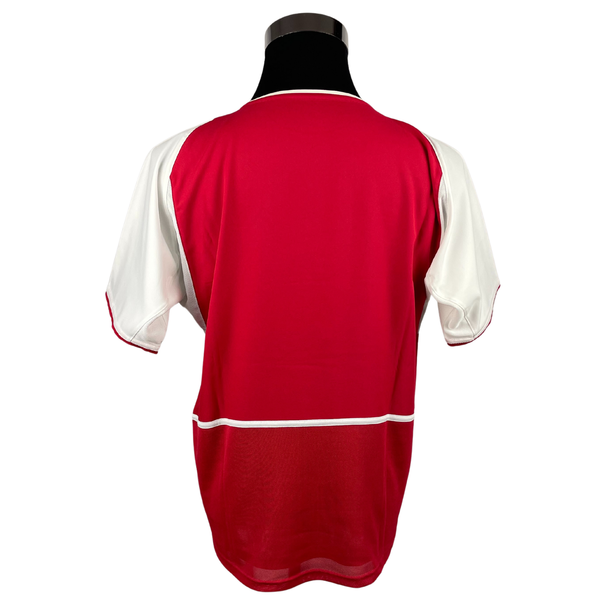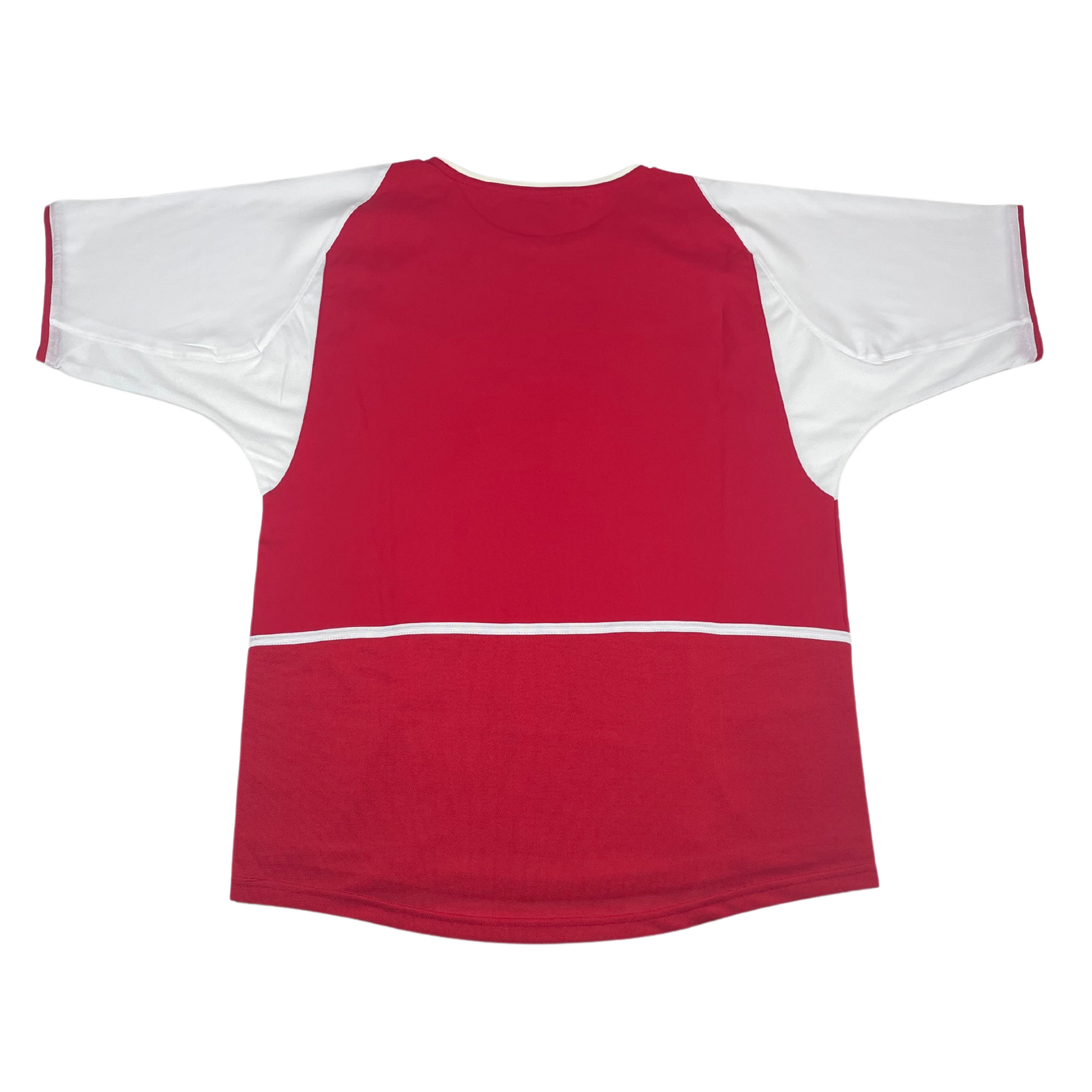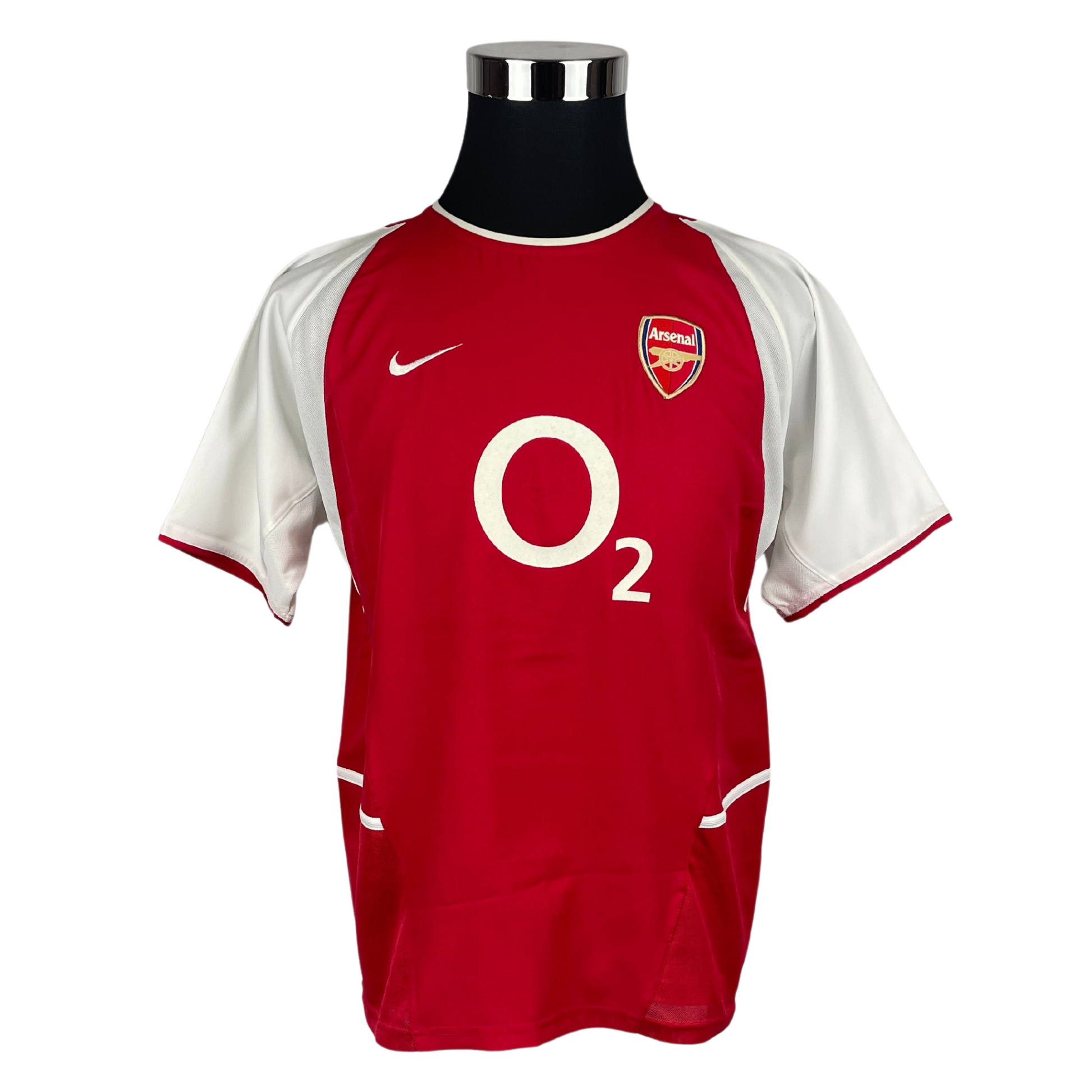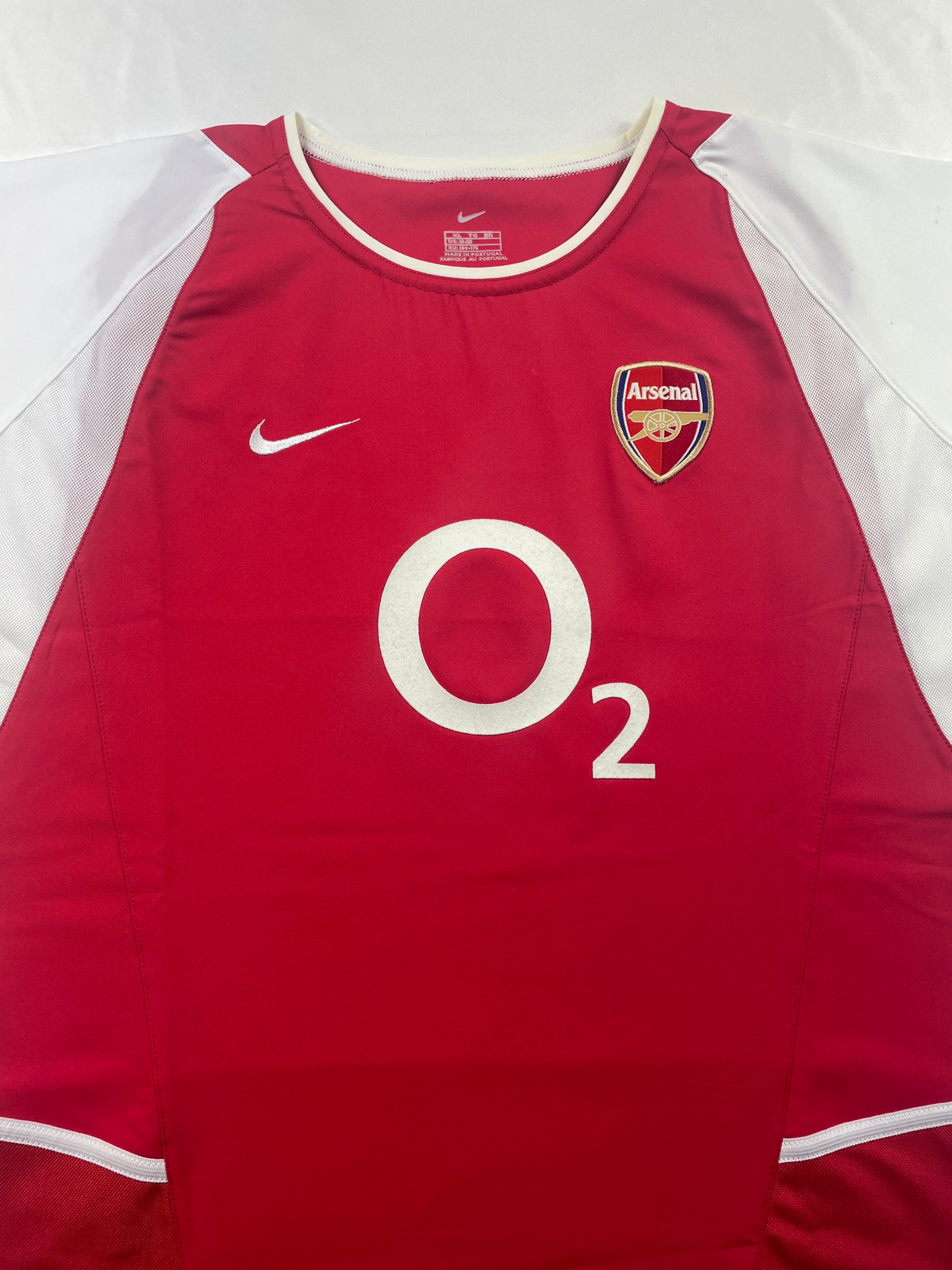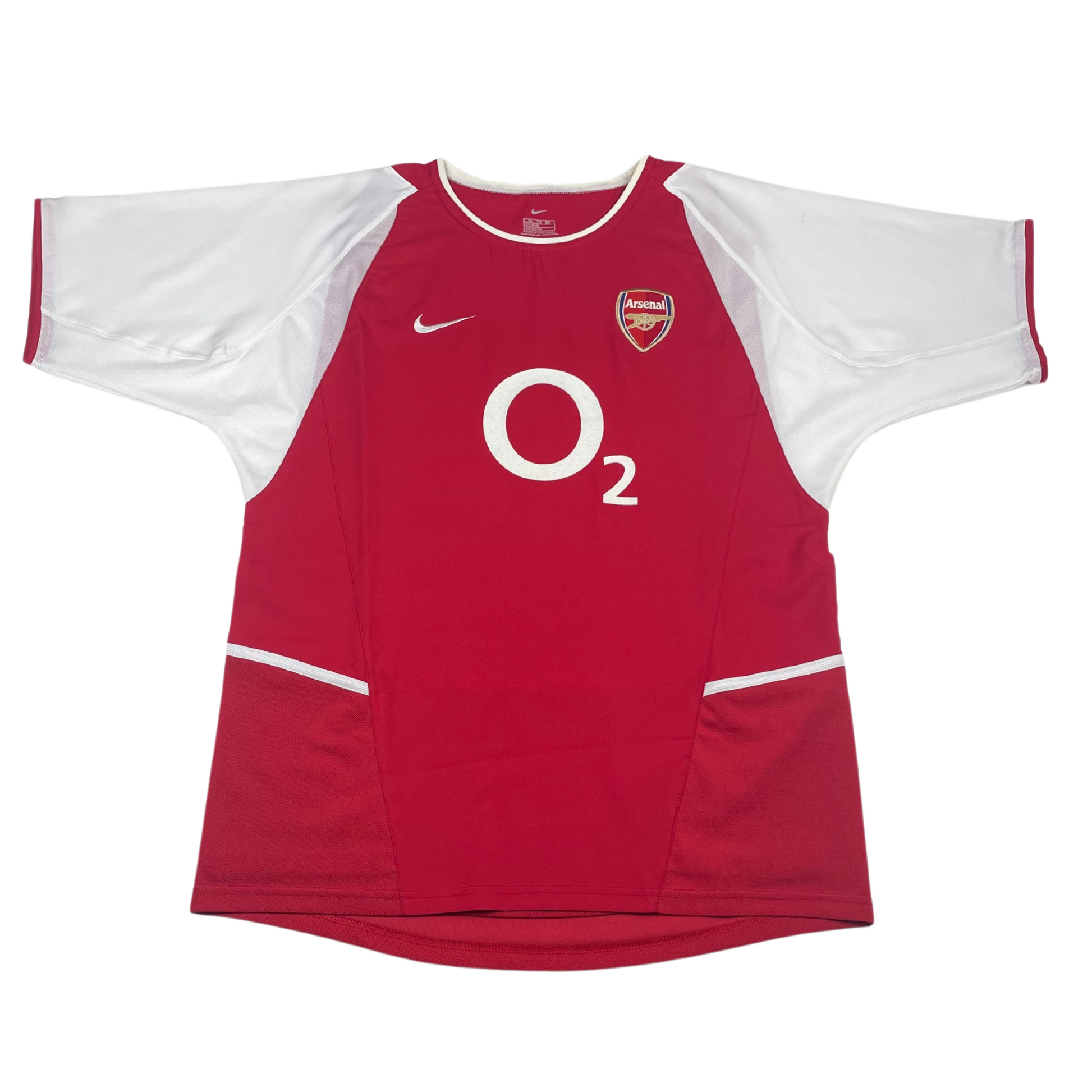 Iconique maillot domicile utilisé durant deux saisons. Á l'issue de la première, les Gunners conservent la FA Cup et occupent la seconde place en Premier League. La saison 2003/2004 marque une domination historique puisque les hommes d'Arsène Wenger restent invaincus en championnat décrochant ainsi le titre de champion et d'Invincibles. Henry est dans la forme de sa carrière avec 71 buts cumulés sur ces deux saisons.