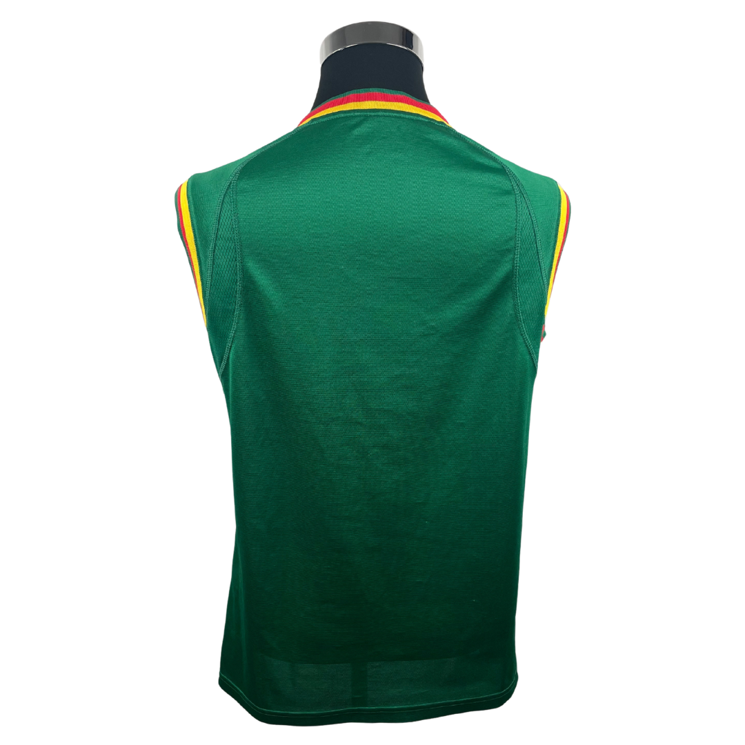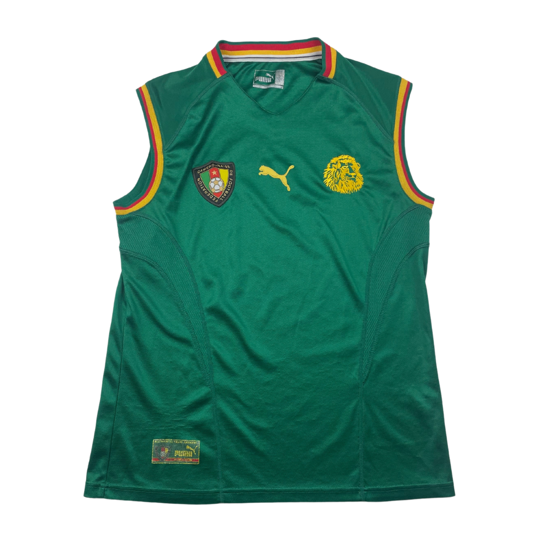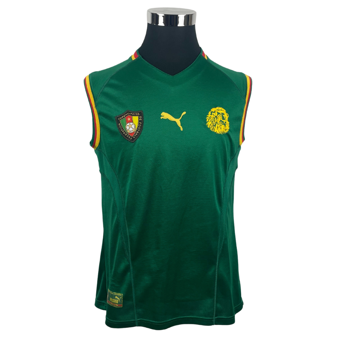 Le mythique maillot sans manches des Lions Indomptables. Les camerounais l'utilise d'abord dans cette configuration au cours de la Coupe d'Afrique des Nations qu'ils remportent avant de participer à la Coupe du Monde. Pour cette dernière, la FIFA oblige le port de manches qui sont alors ajoutées à la hâte. L'équipe ne poursuivra pas sur sa lancée continentale avec une élimination dès la phase de poules.