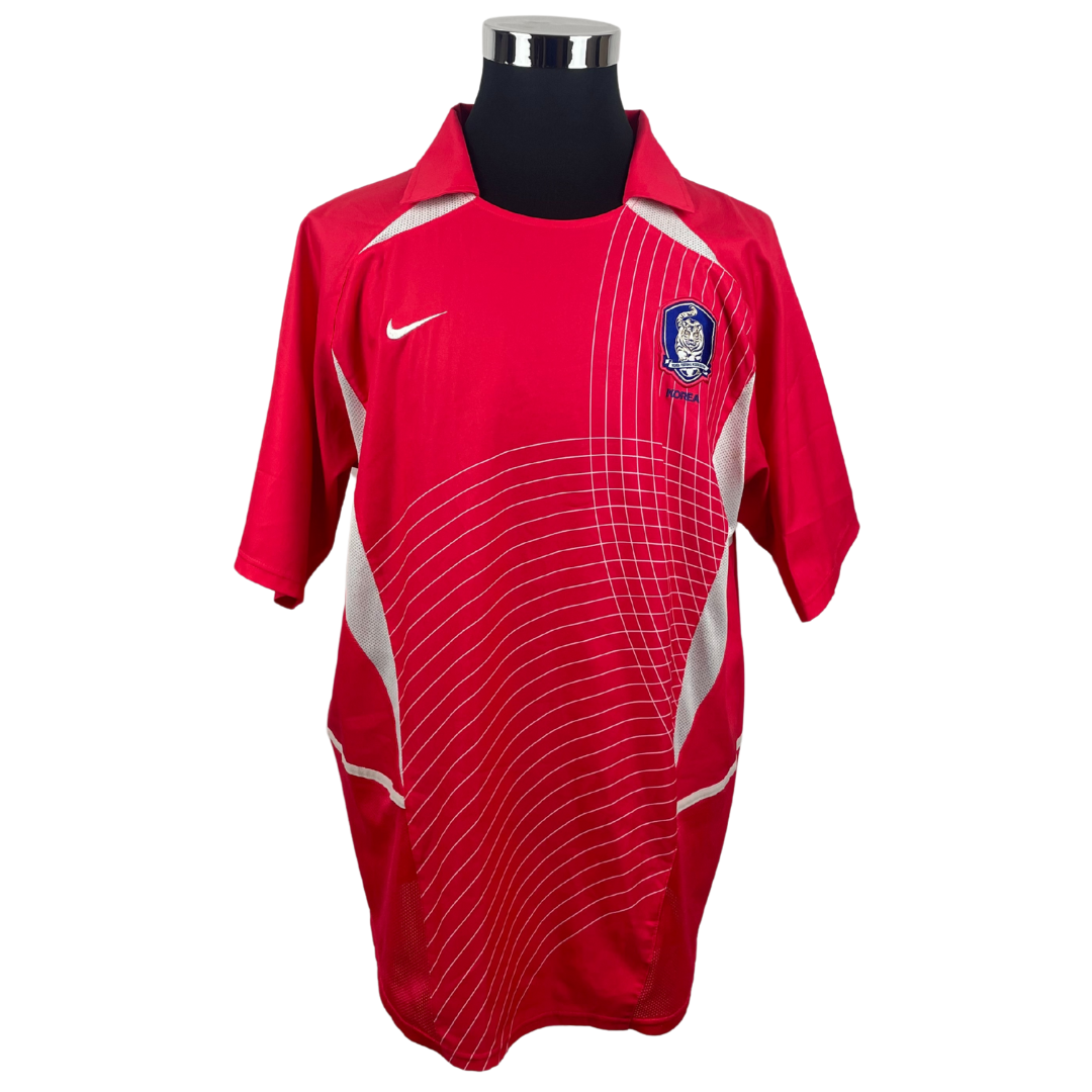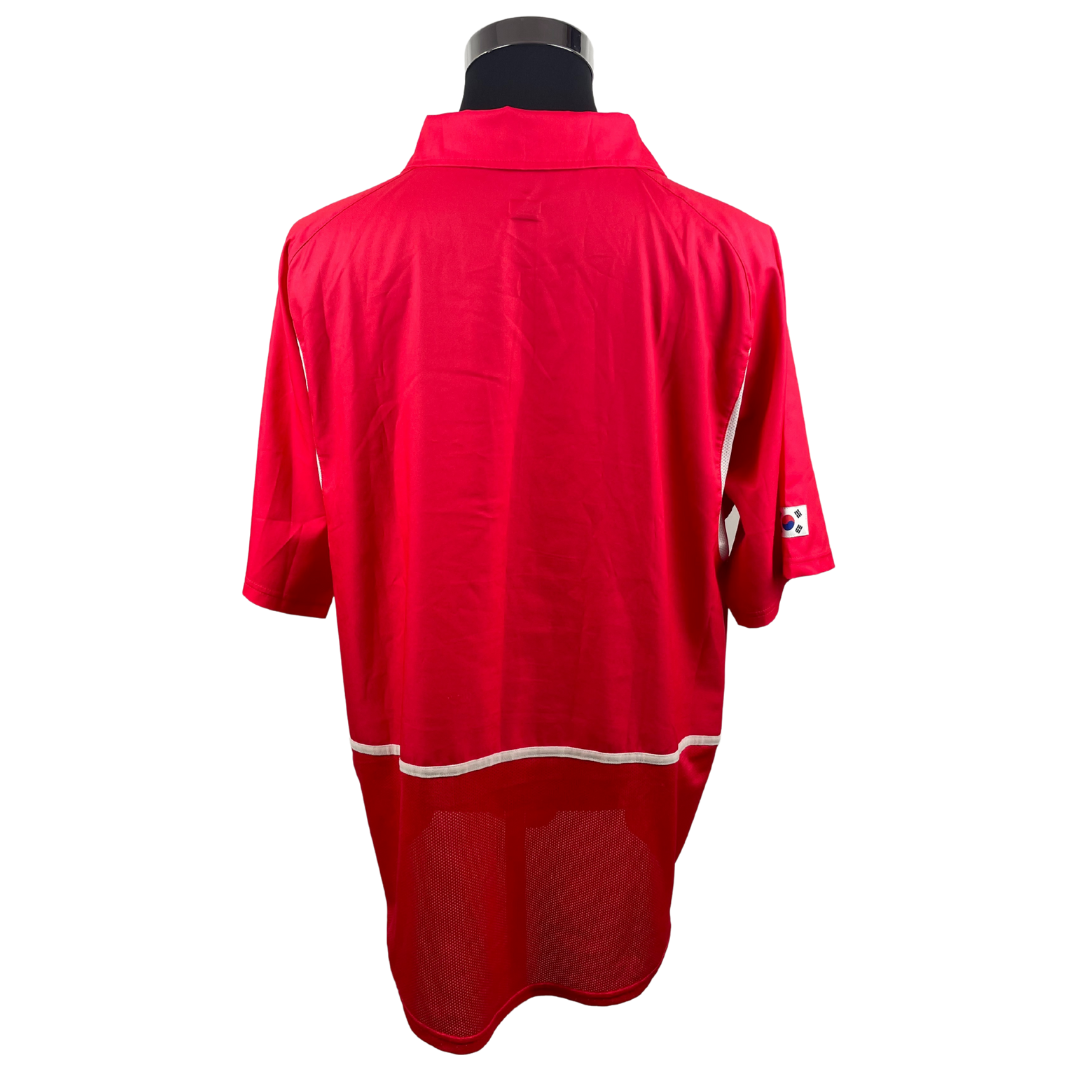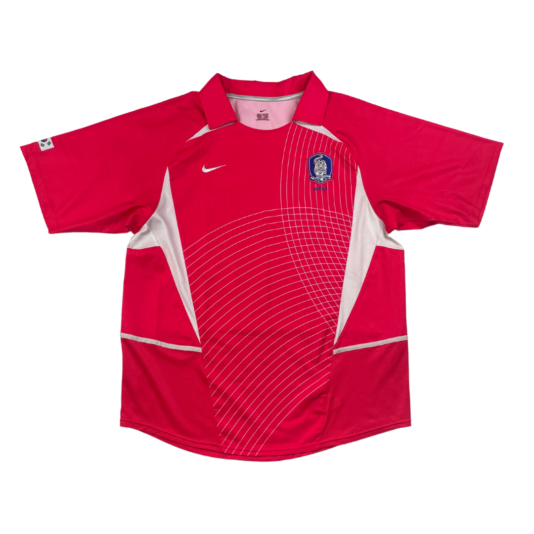 Maillot domicile des sud-coréens co-organisateurs de la Coupe du Monde 2002 avec le Japon. La sélection dirigée par Guus Hiddink surprend tous les observateurs en atteignant les demi-finales après avoir battu le Portugal en poule, l'Italie en huitième puis l'Espagne en quart.