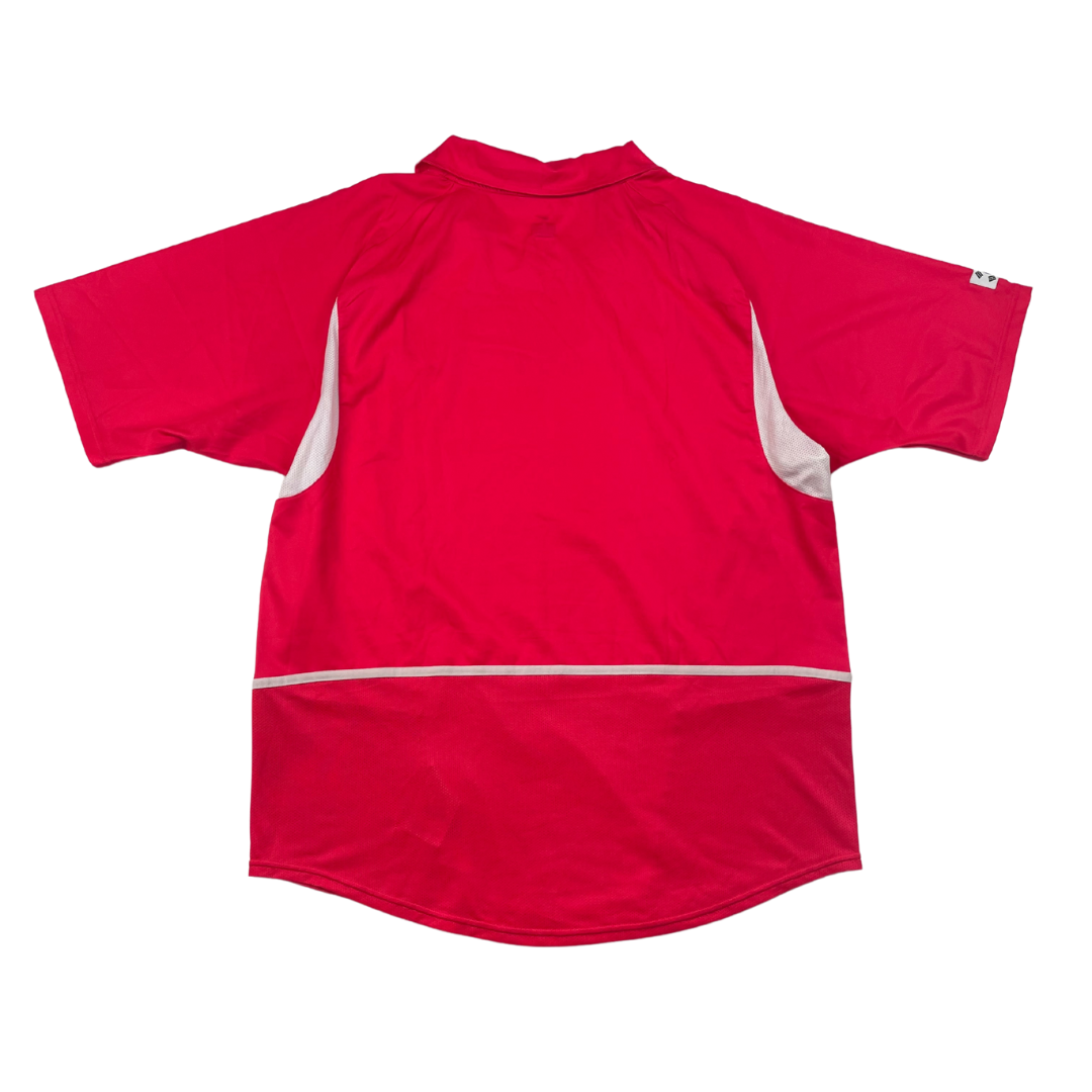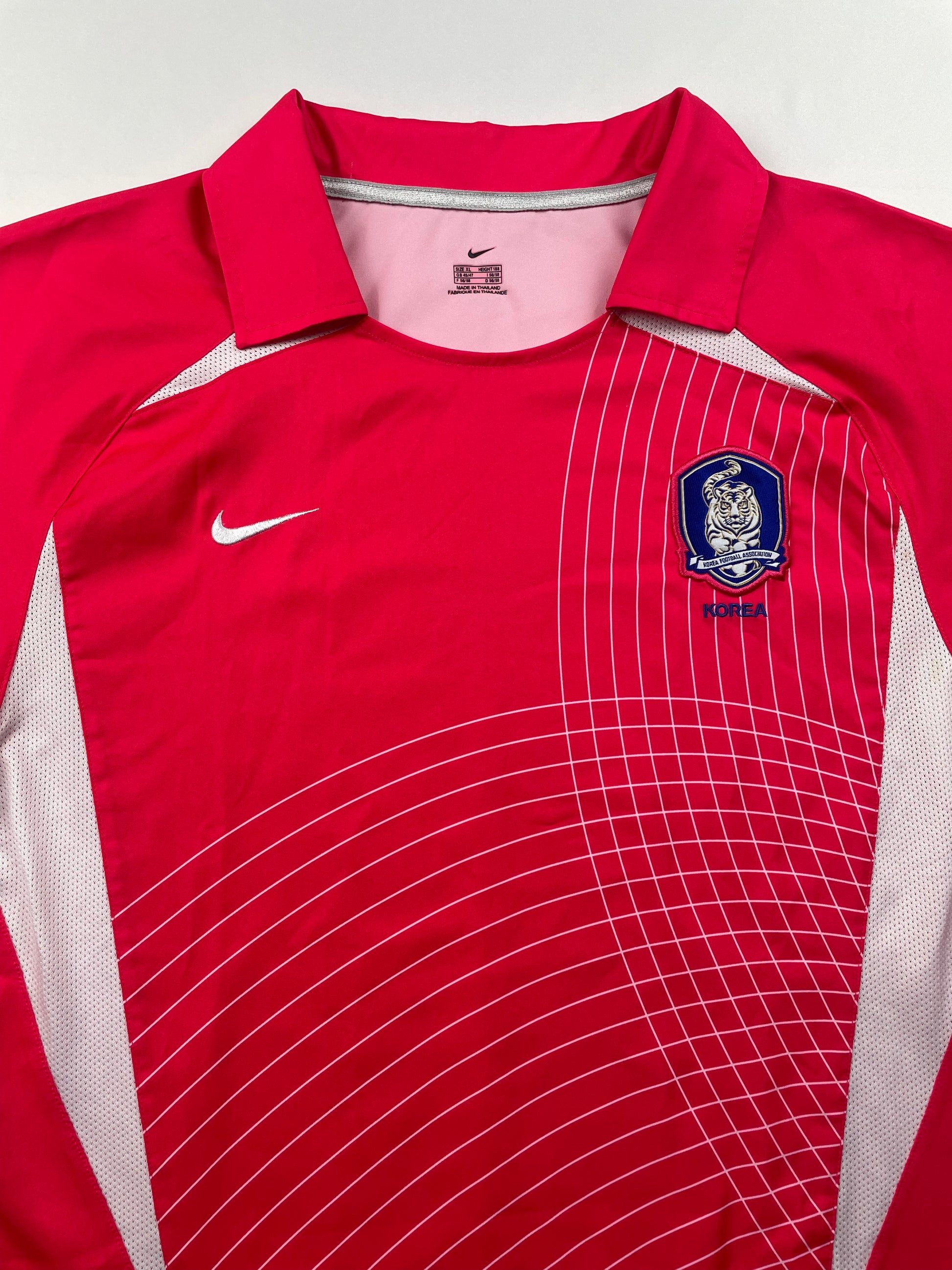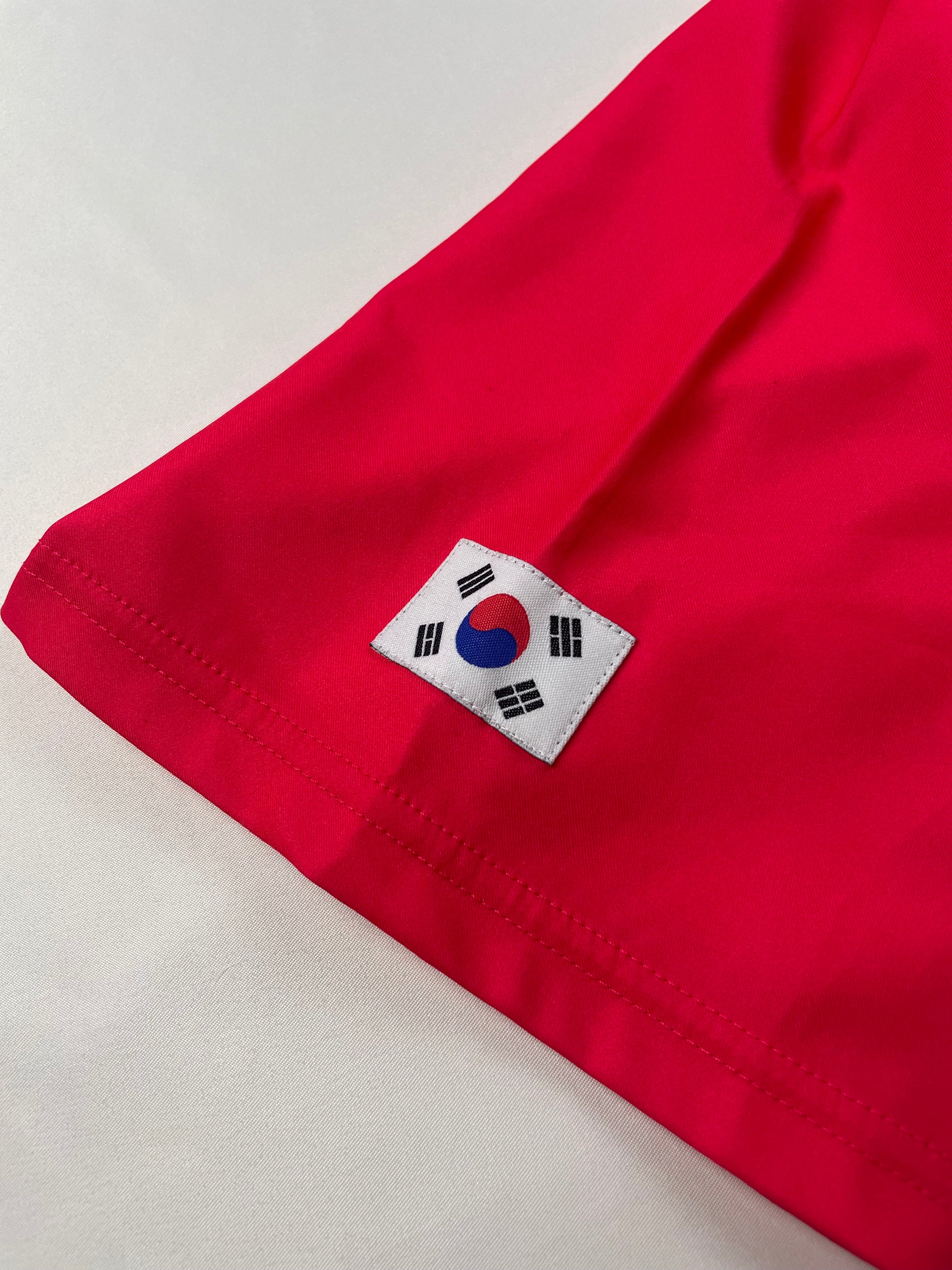 Maillot domicile des sud-coréens co-organisateurs de la Coupe du Monde 2002 avec le Japon. La sélection dirigée par Guus Hiddink surprend tous les observateurs en atteignant les demi-finales après avoir battu le Portugal en poule, l'Italie en huitième puis l'Espagne en quart.
