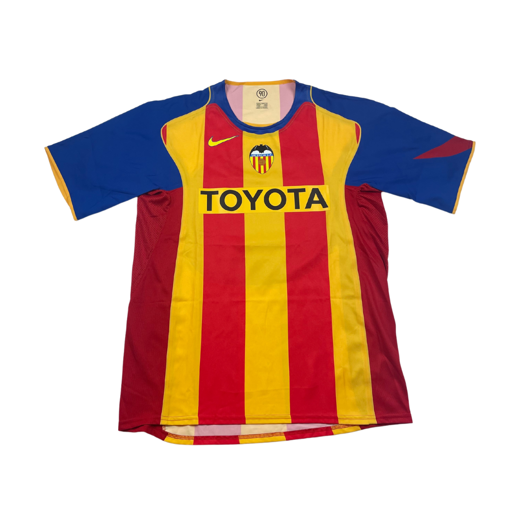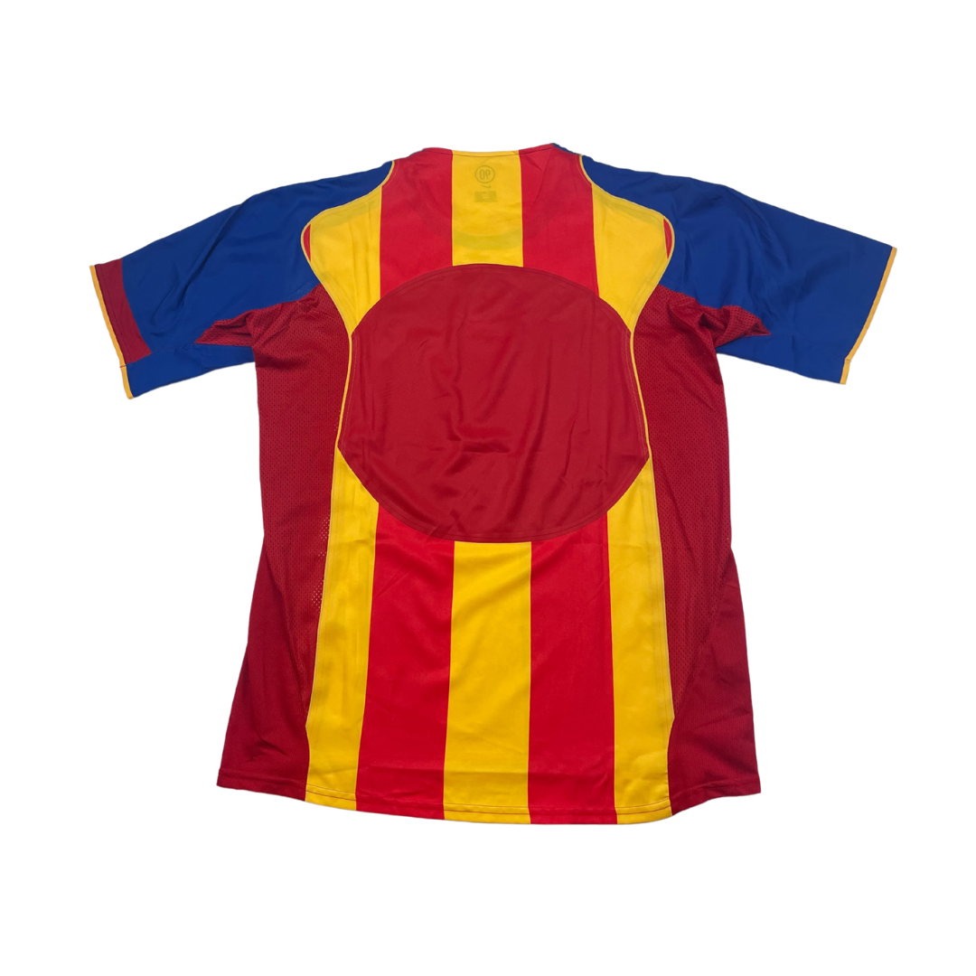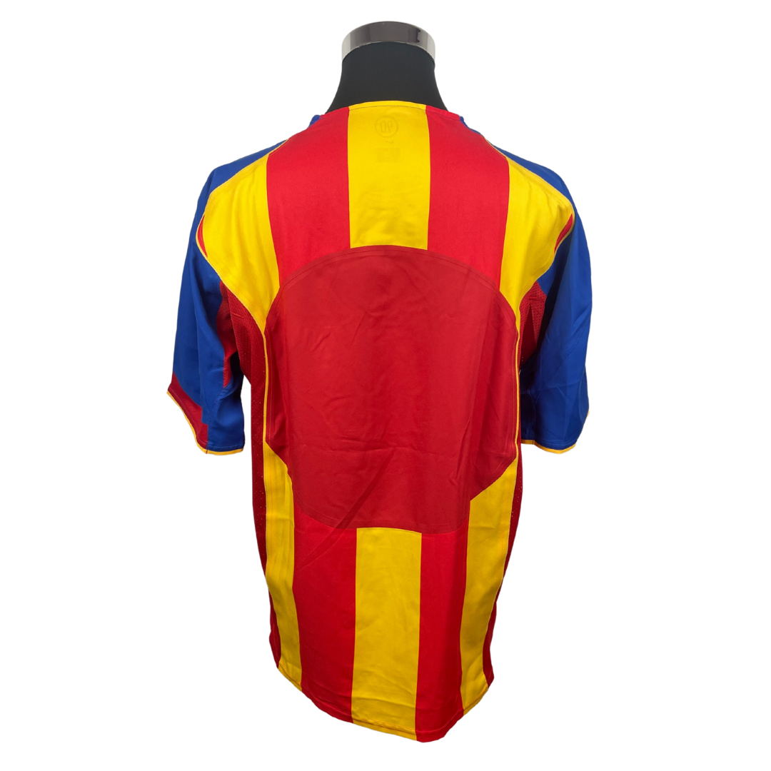 Maillot issu du stock professionnel destiné aux matchs européens. L'UEFA imposait des règles strictes notamment sur le flocage et les motifs d'où la présence d'un fond uni pour casser les rayures et augmenter la lisibilité.