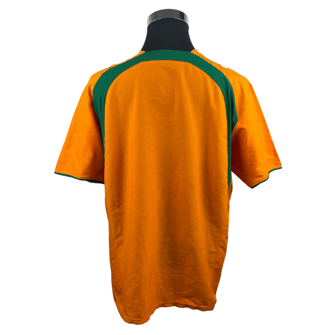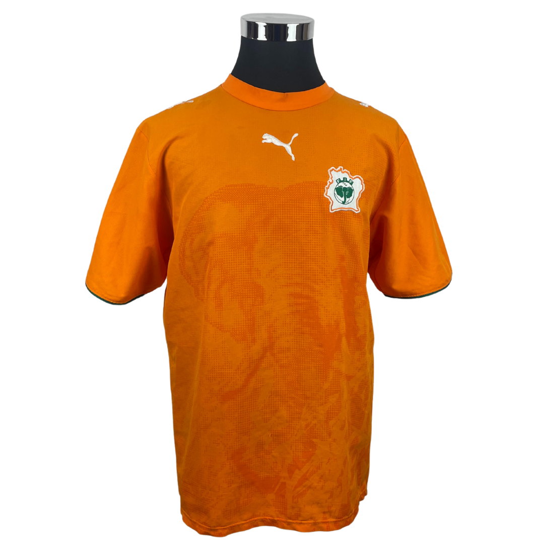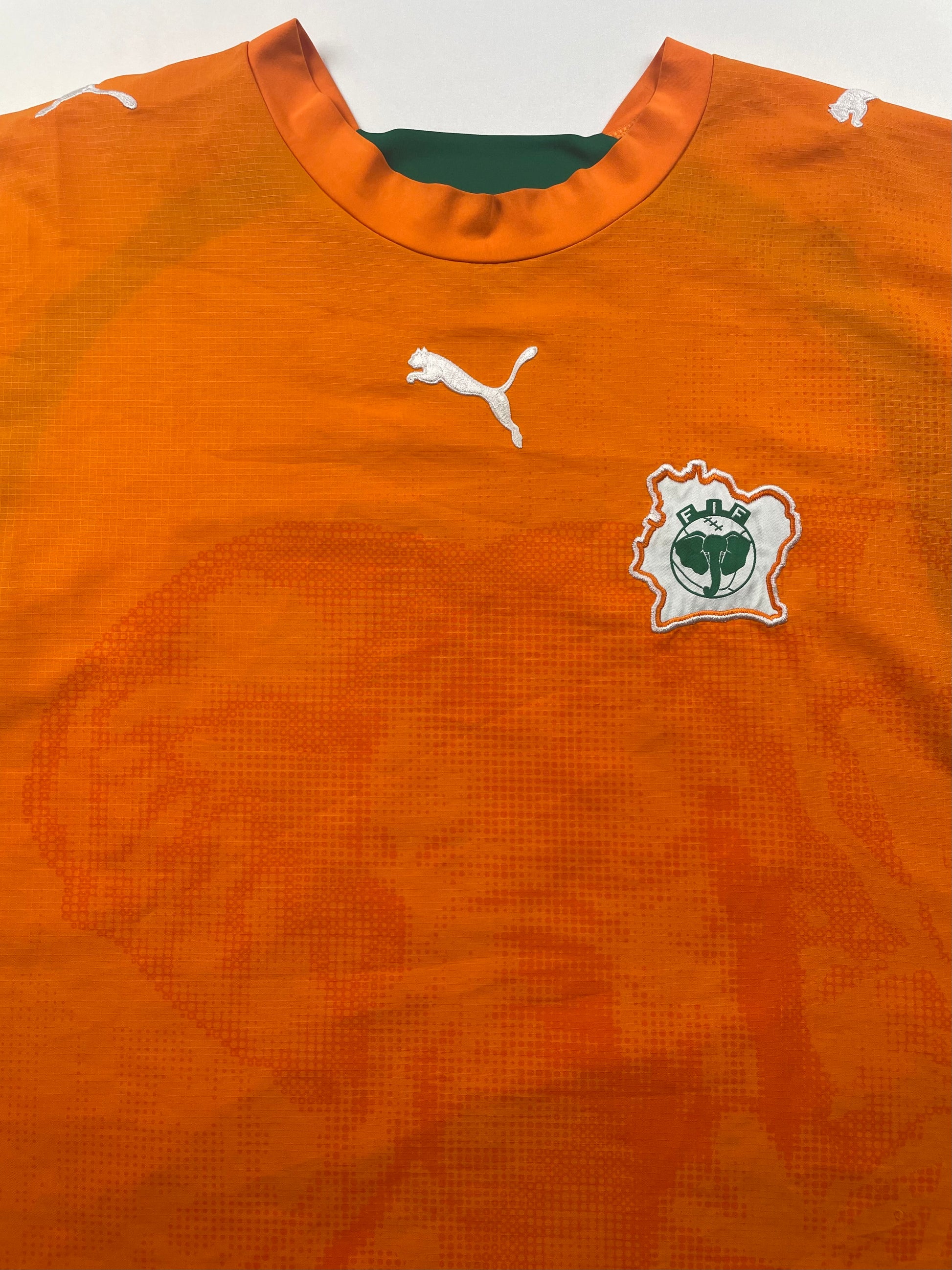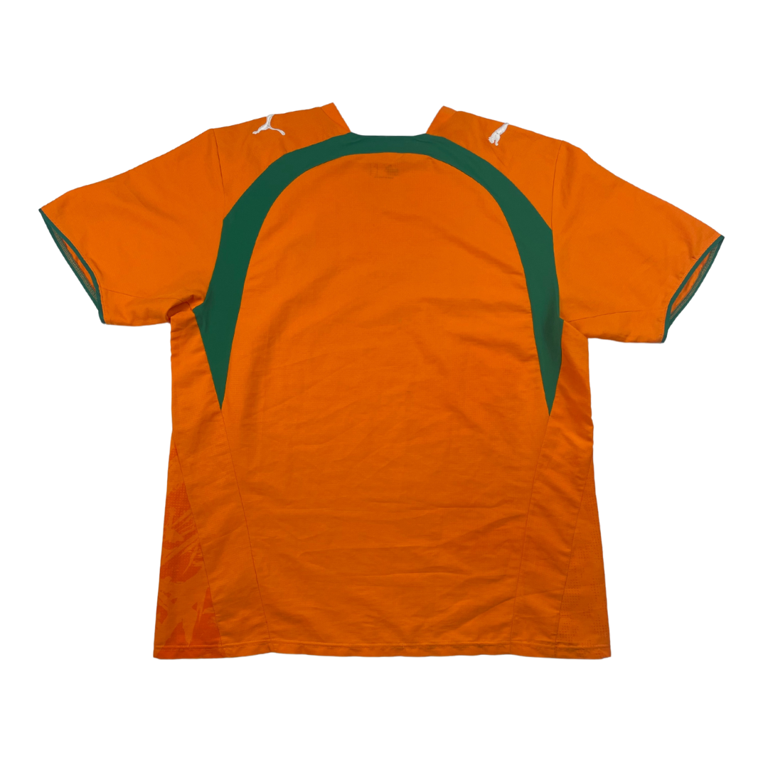 Maillot domicile des Eléphants vaincus en finale de la Coupe d'Afrique des Nations par l'Egypte pays hôte de la compétition. Lors de la Coupe du Monde qui se déroule en Allemagne quelques mois plus tard, ils ne parviennent pas à sortir d'un groupe relevé composé de l'Argentine, des Pays-Bas ainsi que de la Serbie-et-Monténégro.