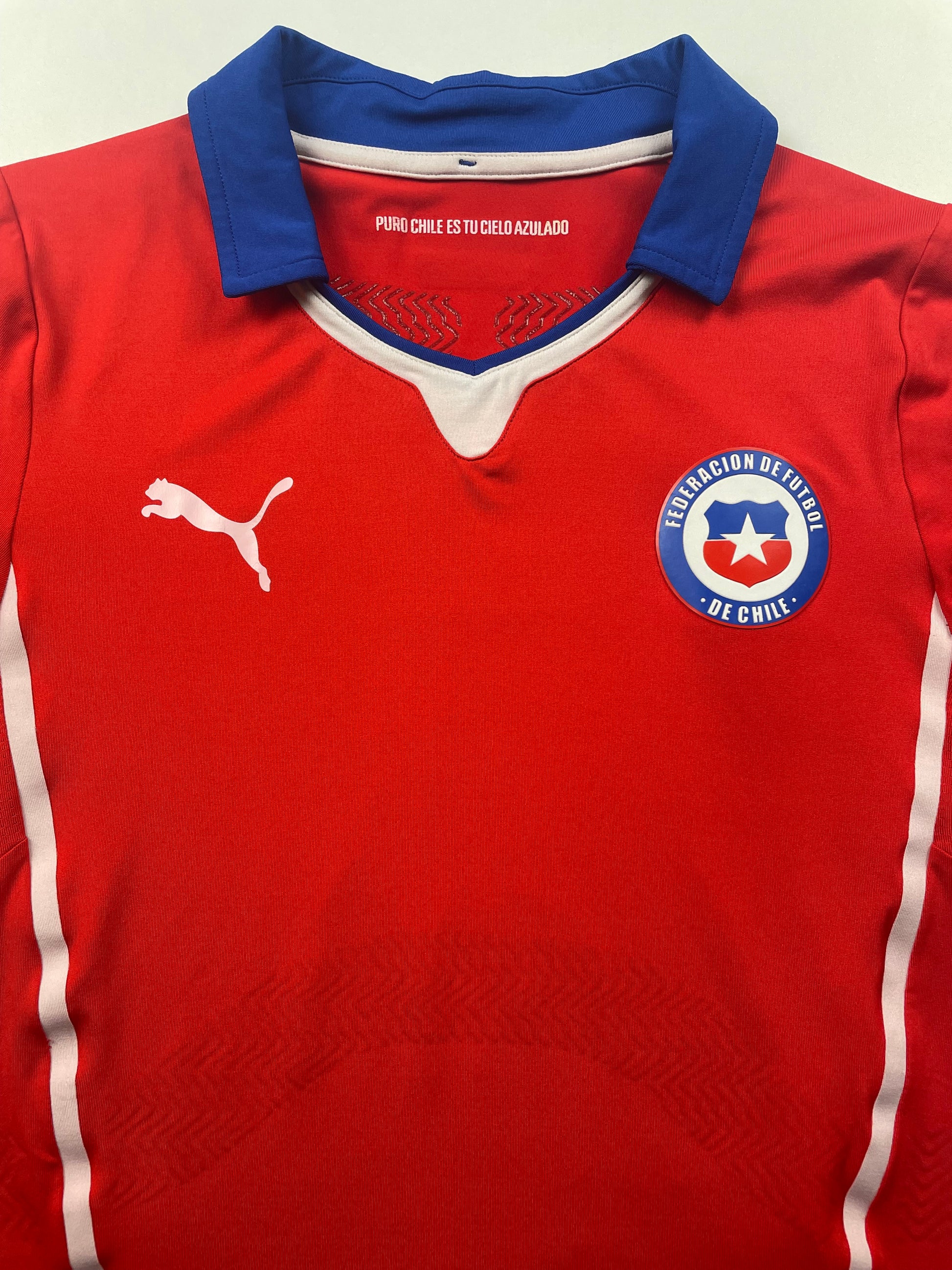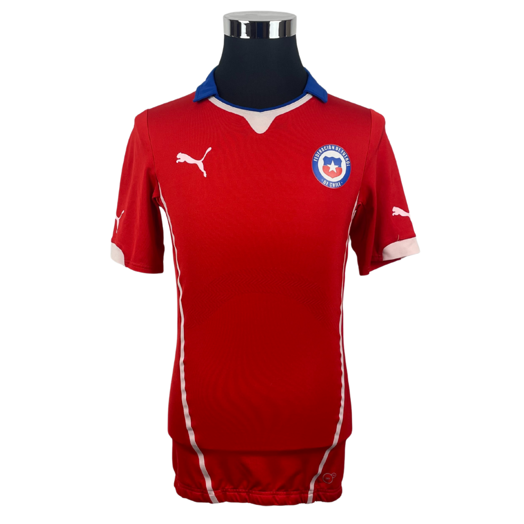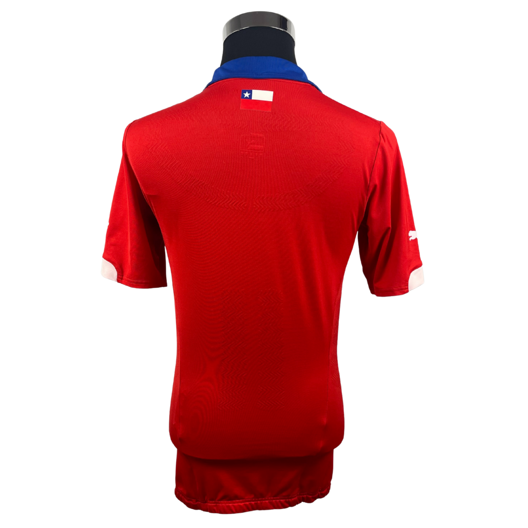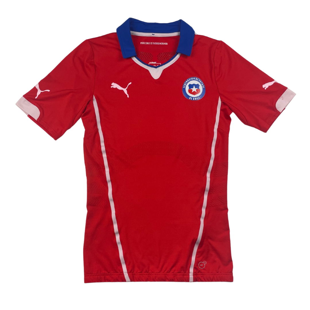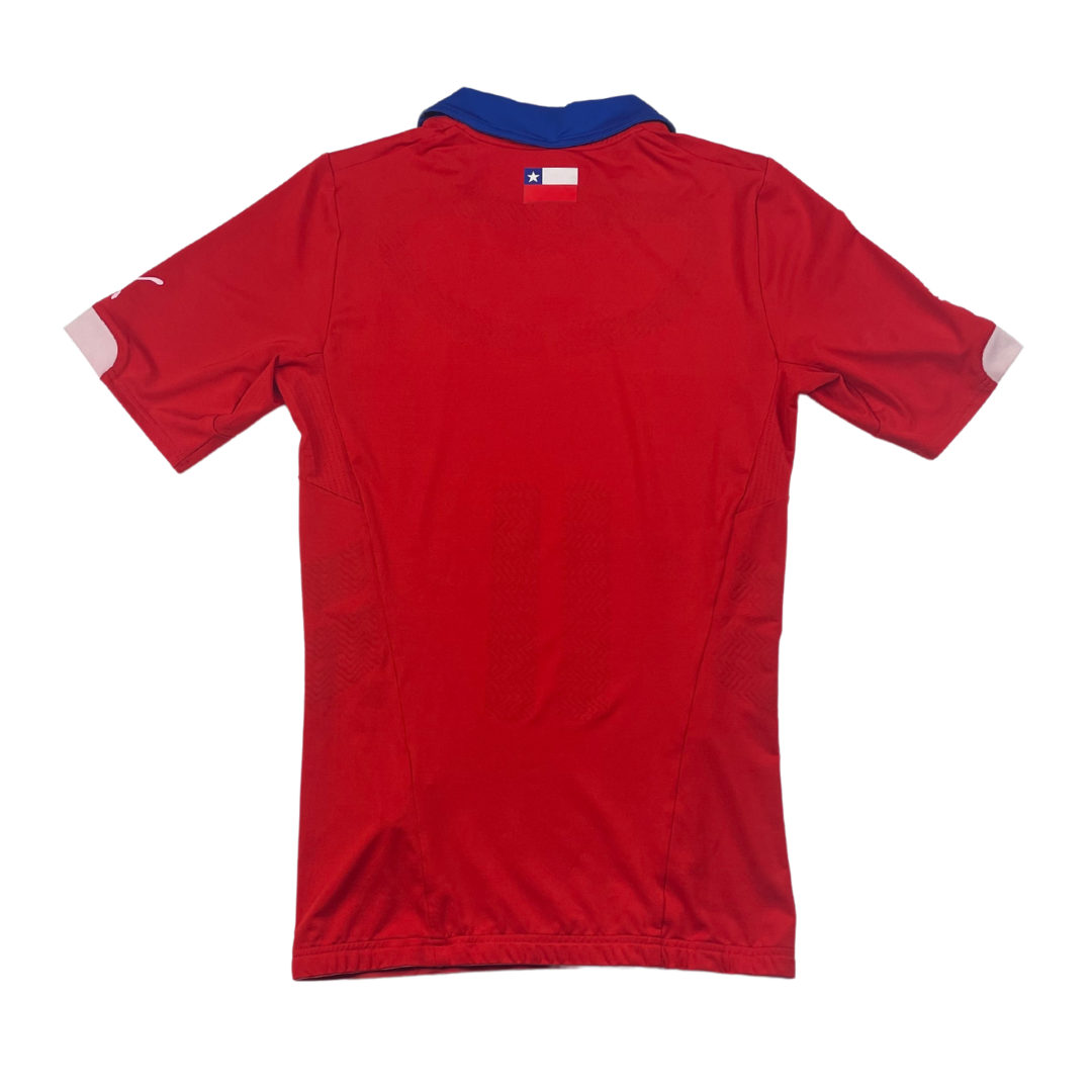 Maillot utilisé lors de la Coupe du Monde 2014 disputée au Brésil. C'est d'ailleurs le pays hôte qui met un terme au parcours des chiliens en huitième de finale. L'année suivante à domicile, le Chili remporte la Copa America aux tirs au but face à l'Argentine.