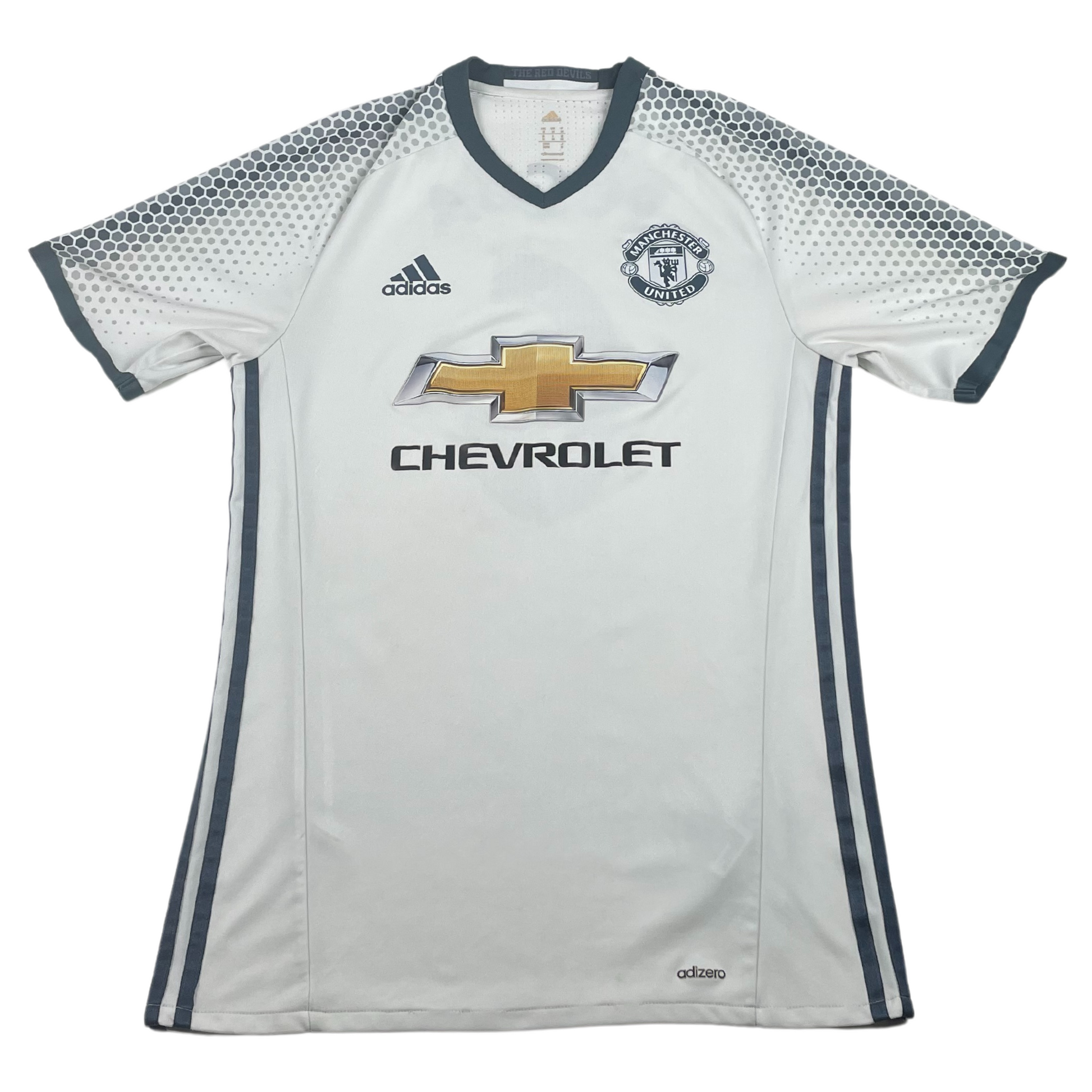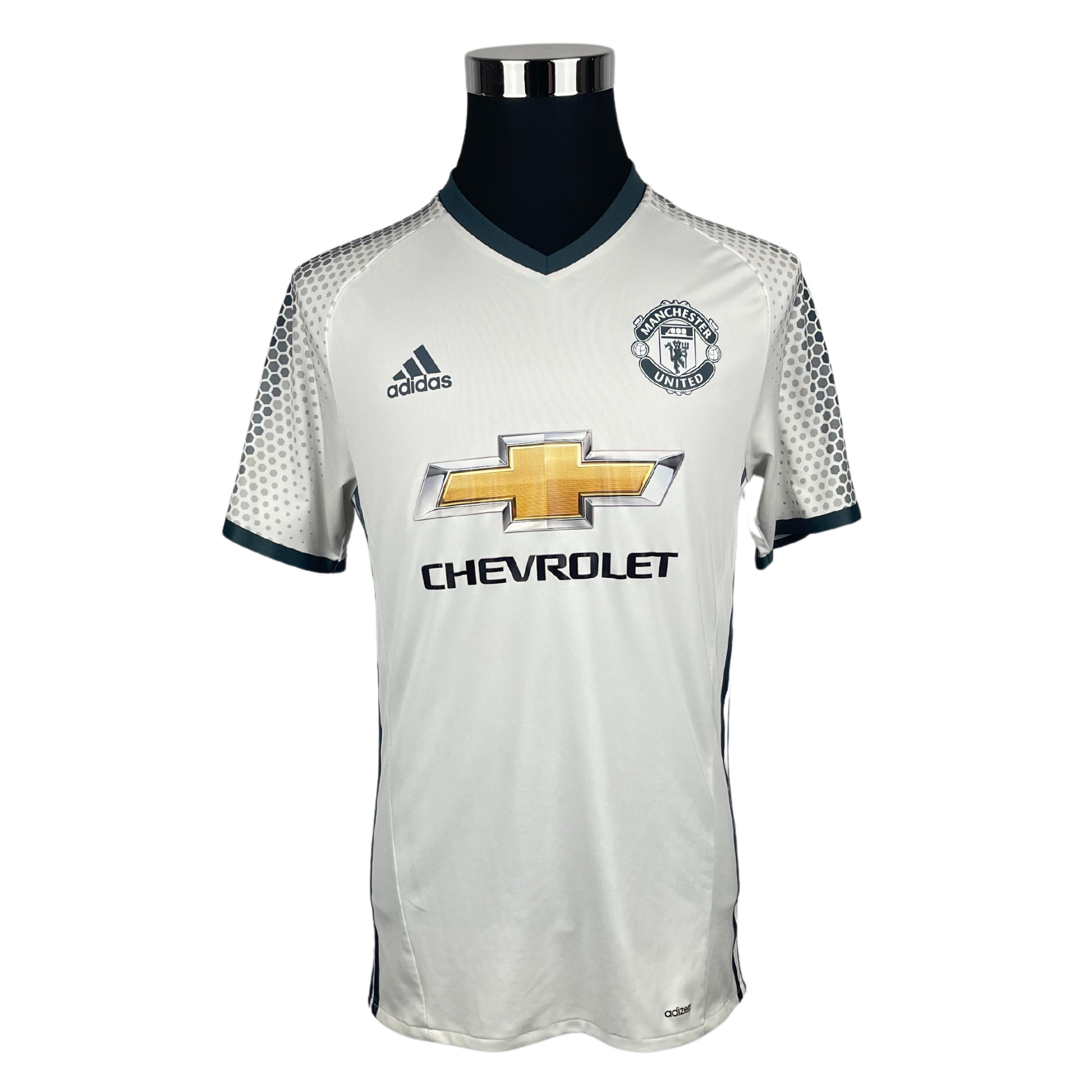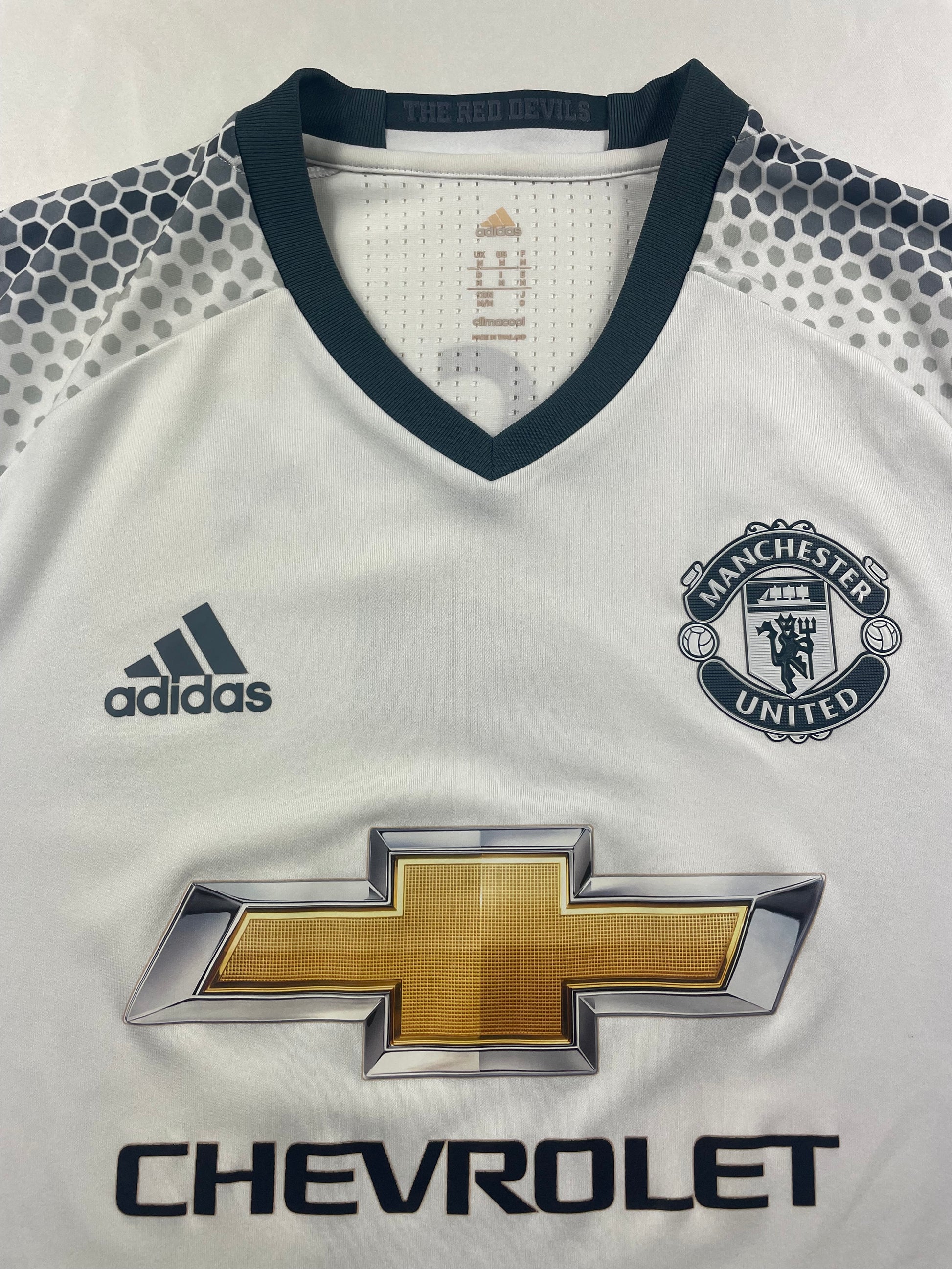 Troisième maillot lorsque José Mourinho prend la tête des Red Devils avec de grandes attentes après le transfert record de l'international français et ancien joueur de l'académie Paul Pogba. Le Special One termine la saison à une décevante 6e place en championnat mais parvient à ramener deux trophées avec la League Cup et la première Europa League de l'histoire du club.